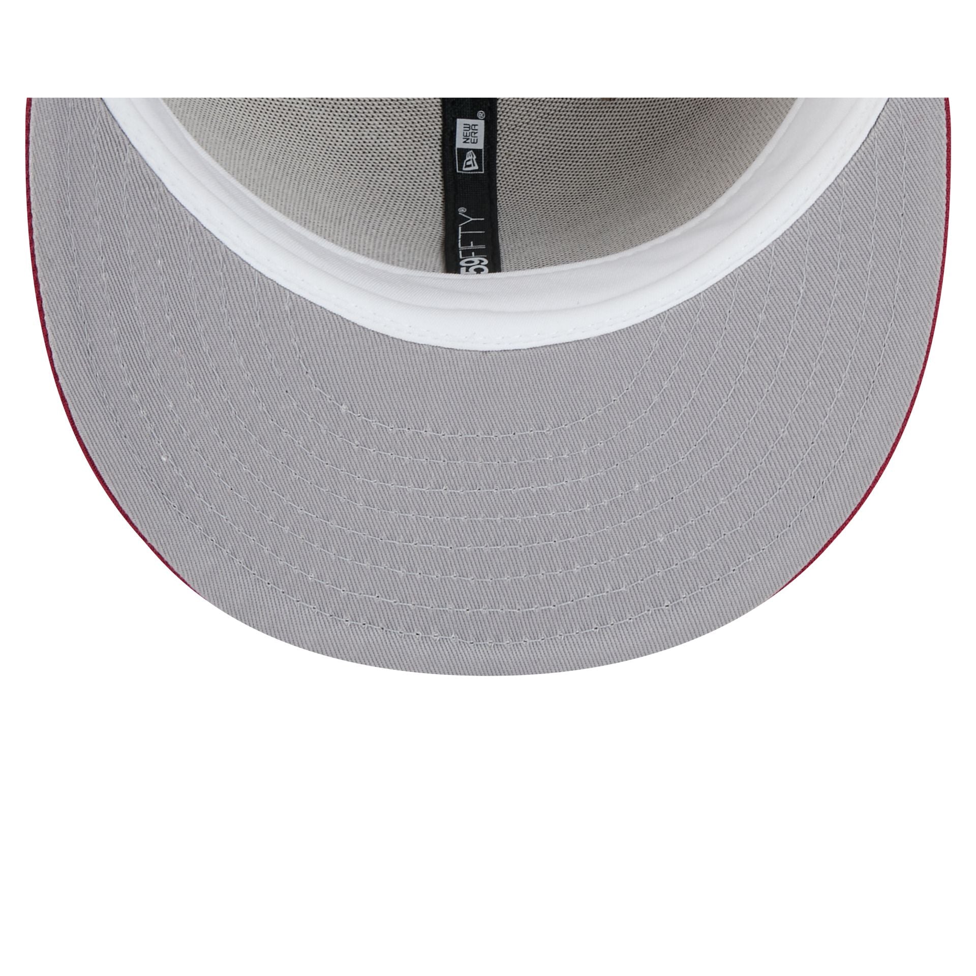 The Alabama Crimson Tide Camel College Vault 59FIFTY Fitted Cap features an embroidered Crimson Tide logo at the front panels with a matching team wordmark at the rear and a gray undervisor.