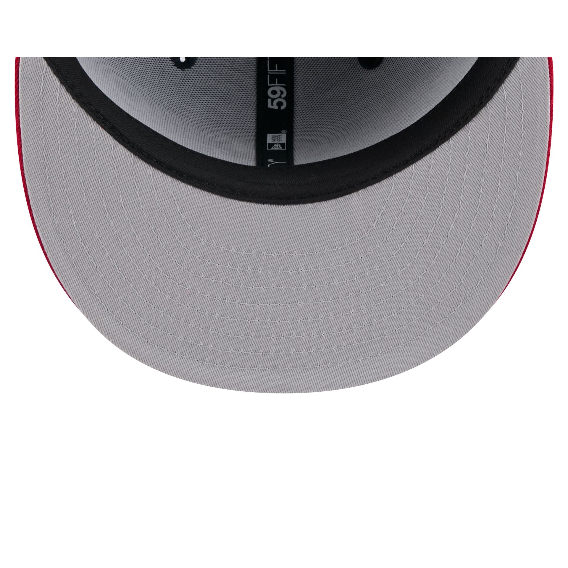 The Atlanta Braves Pinstripe League Pin 59FIFTY Fitted Cap features an embroidered Braves logo at the front panels with a League pin at the front right panel. Additional details include pinstripes. a matching MLB Batterman logo at the rear. and a gray undervisor.
