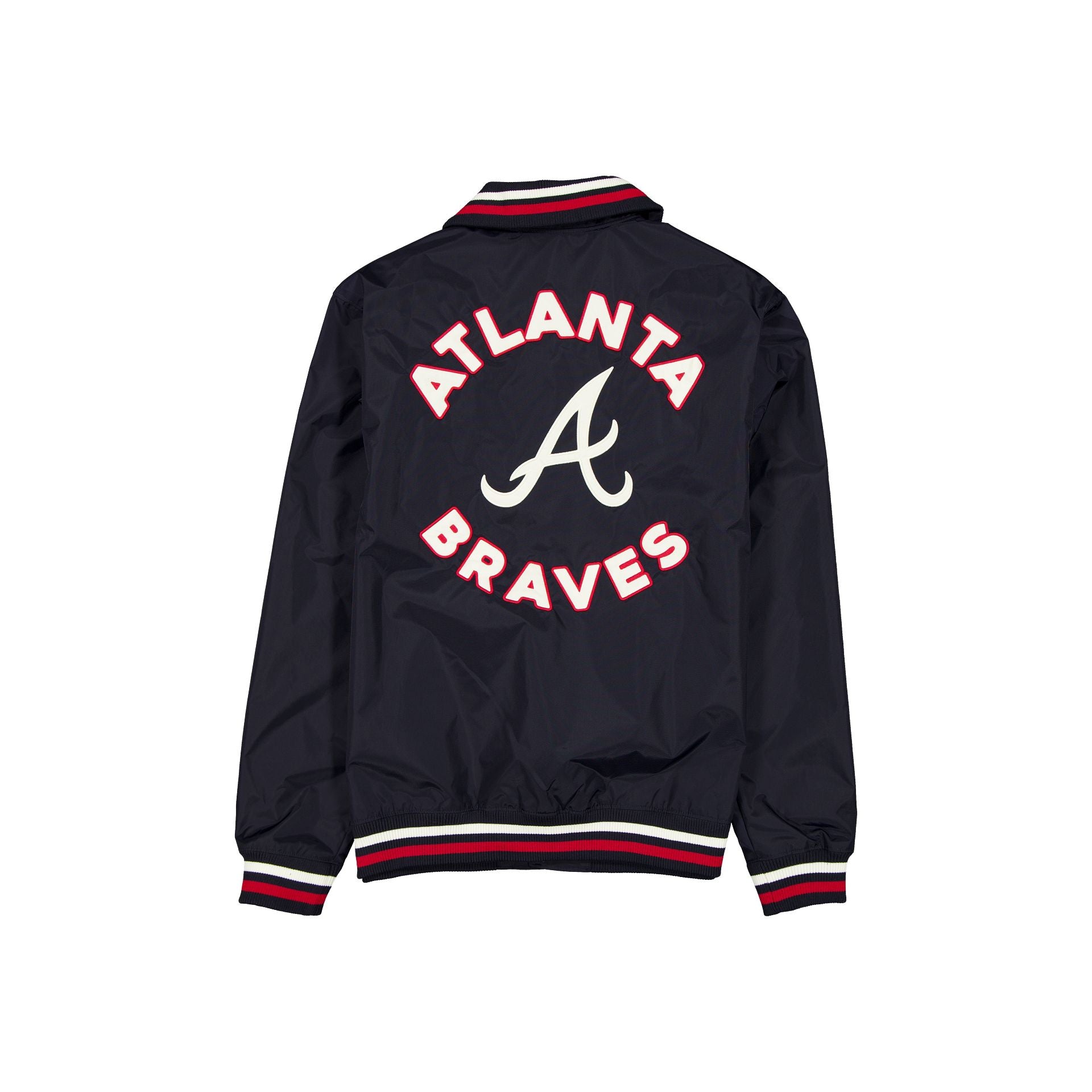 The Atlanta Braves Throwback Jacket features an embroidered Braves logo at the left chest with a logo and wordmark at the rear. Additional details include pockets. a button closure. and a New Era jock tag at the left hip.