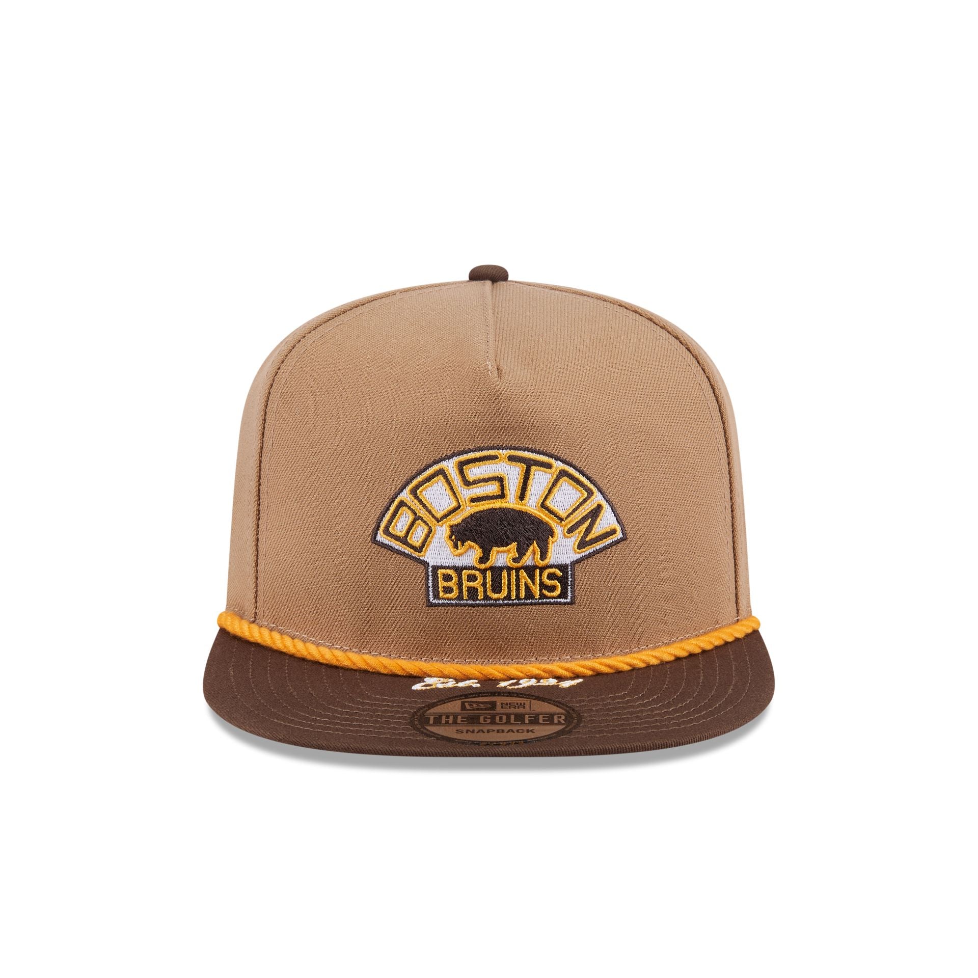 The Boston Bruins Khaki Golfer features an embroidered Bruins Historic logo at the front panels with an established date at the visor. Additional details include a snapback closure at the rear and a green undervisor.