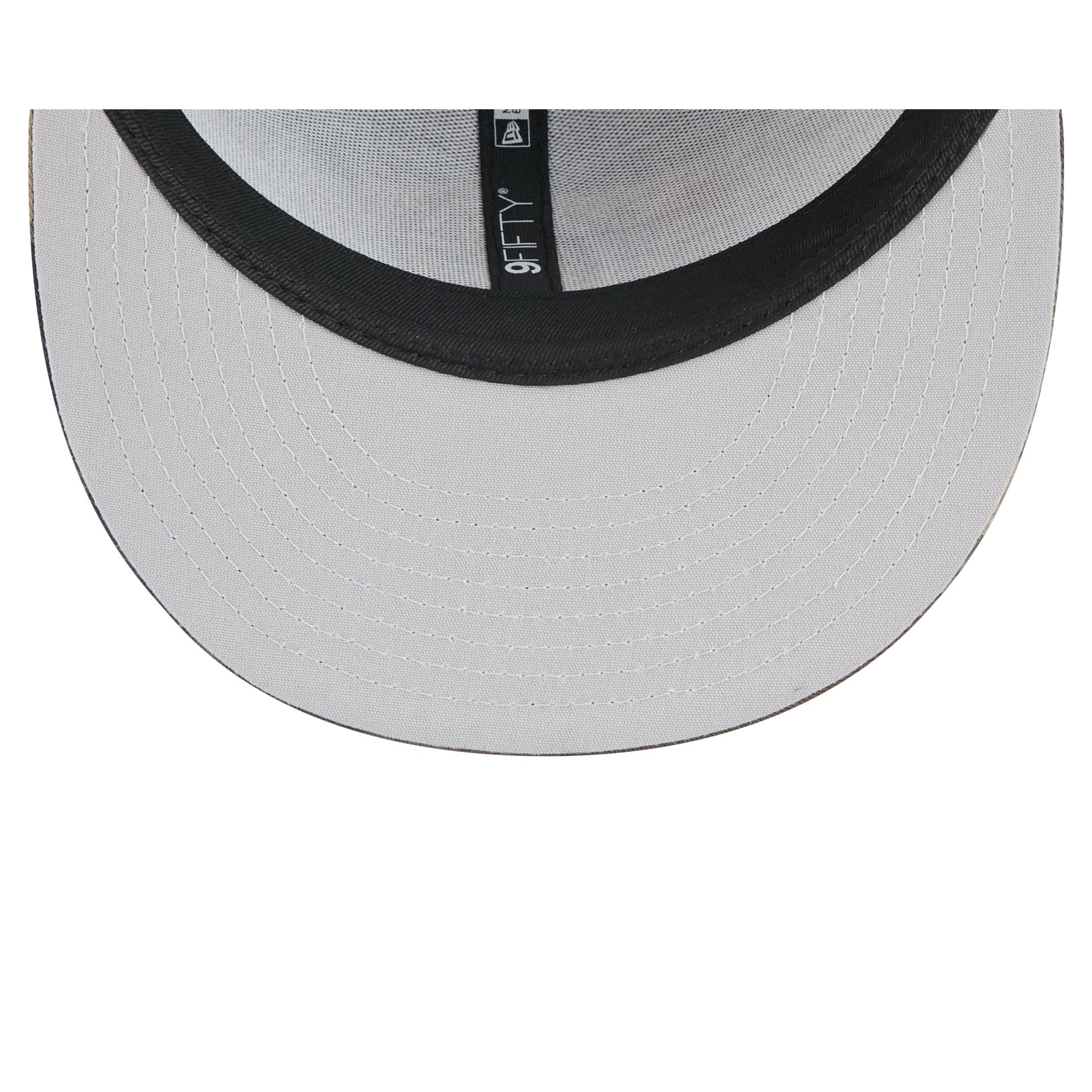 The Calgary Flames Camo 9FIFTY Trucker features an embroidered Flames logo at the front panels with a team tag on a snapback closure at a mesh rear and a gray undervisor.