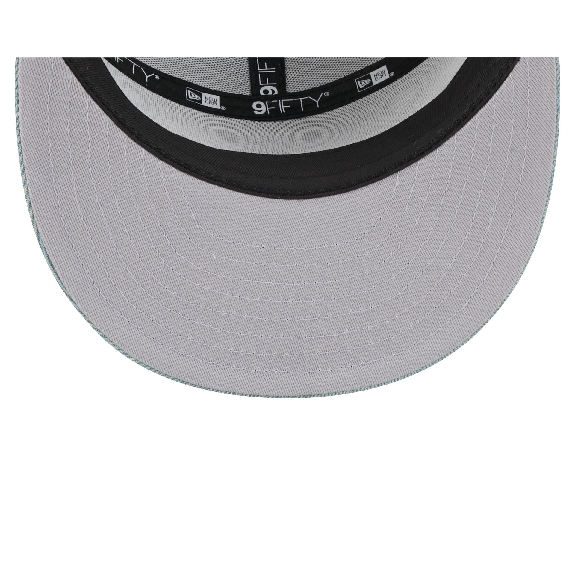 The Los Angeles Dodgers Denim 9FIFTY Split Panel Trucker Hat features an embroidered Dodgers logo at the front panels with an adjustable snapback closure at a mesh rear.