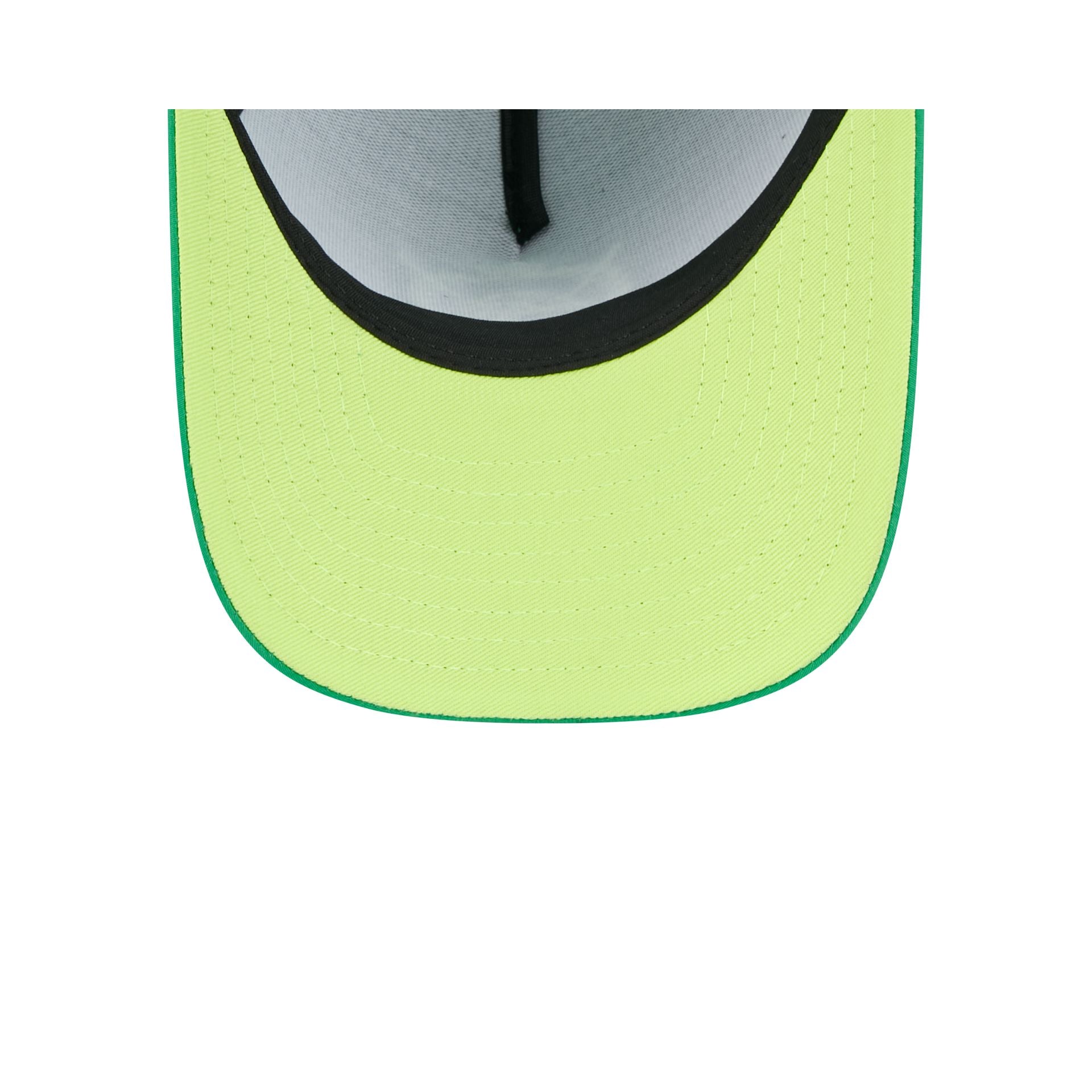 The Los Angeles Lakers Tee Time 9FORTY M-Crown A-Frame Snapback features an embroidered Lakers golf logo at the front panels with a snapback closure at the rear and a neon green undervisor.