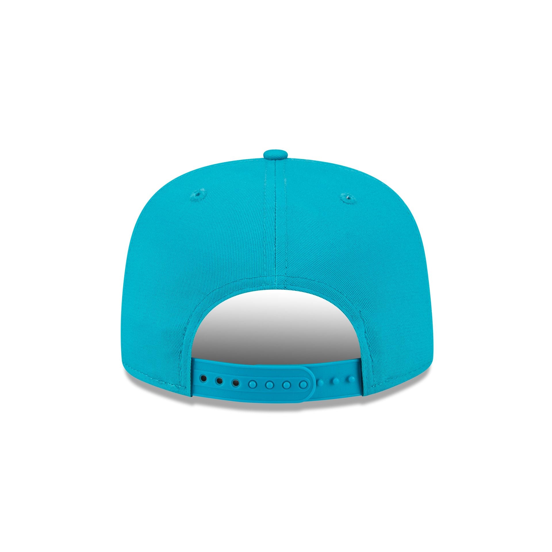 The Miami Dolphins Team Text Golfer features an embroidered Dolphins script at the front panels with a team logo at the right-wear side and a snapback closure at the rear.