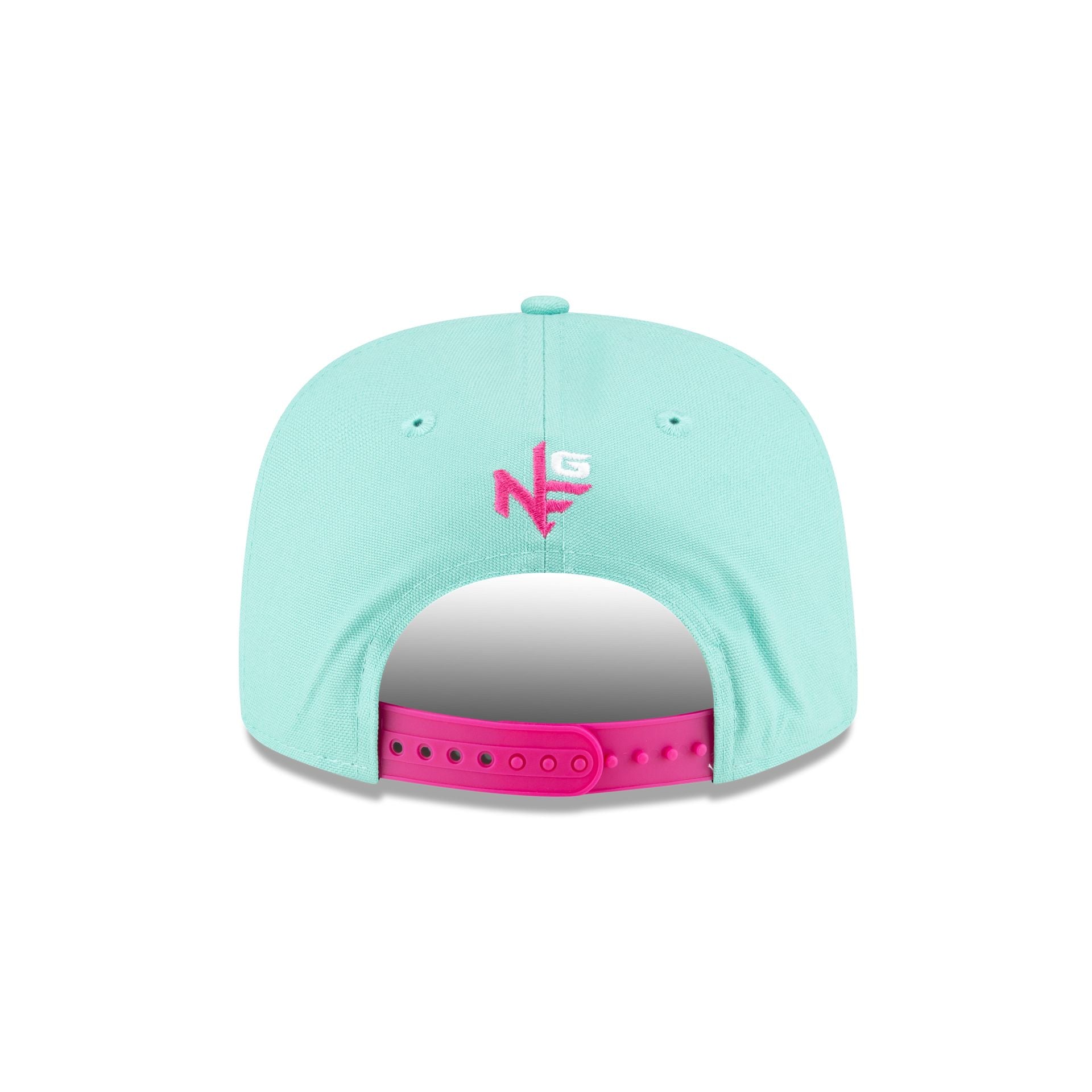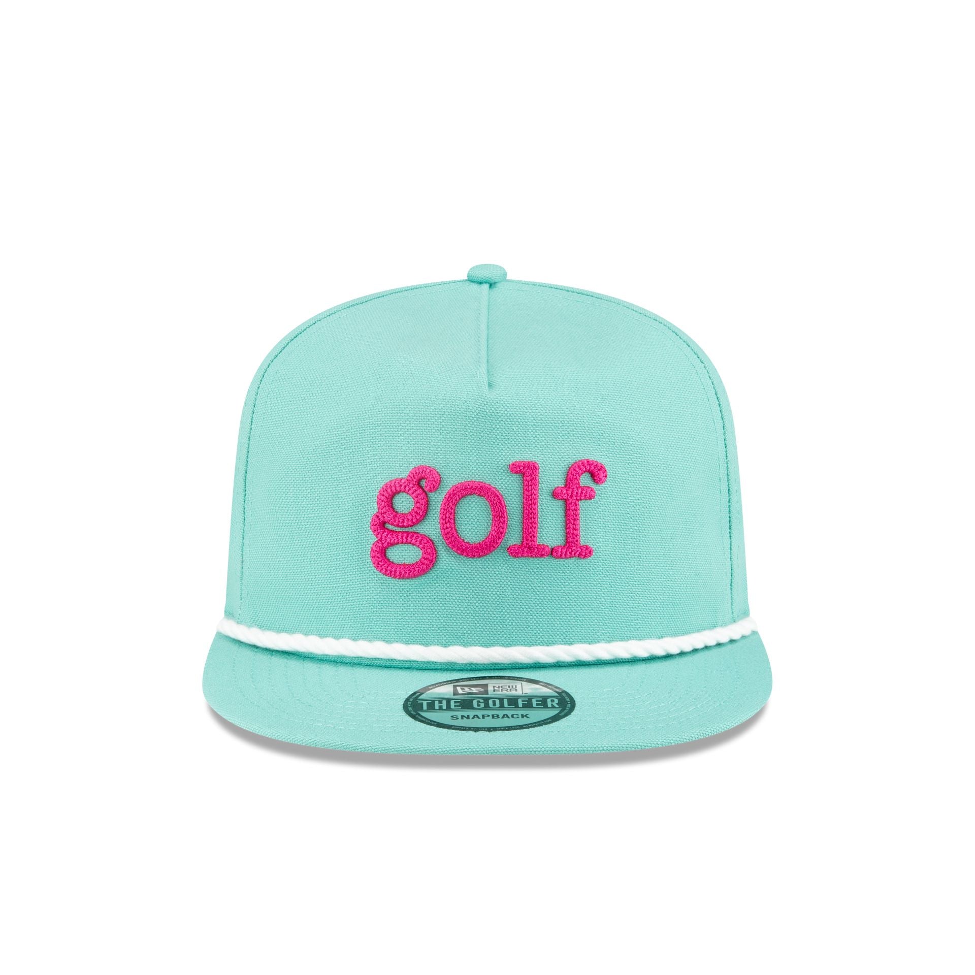 The New Era Golf Mint Green Golfer features an embroidered golf text at the front panels with a New Era Golf logo above a snapback closure at the rear and a pink undervisor.