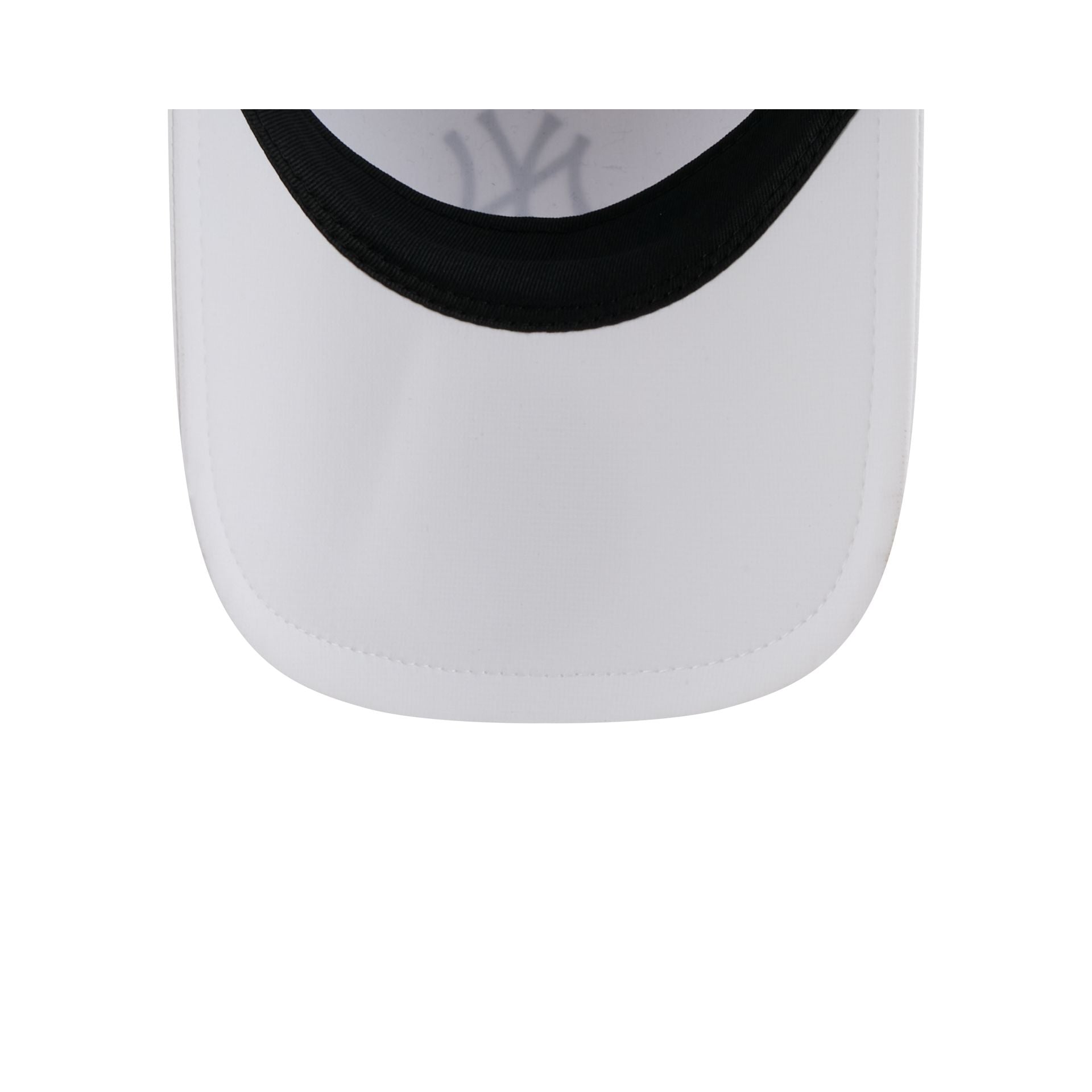 The New York Yankees White Poly Runner Cap features a heat sealed Yankees logo at the front panels with mesh side panels. Additional details include a silicone patch above an adjustable drawstring closure at the rear.