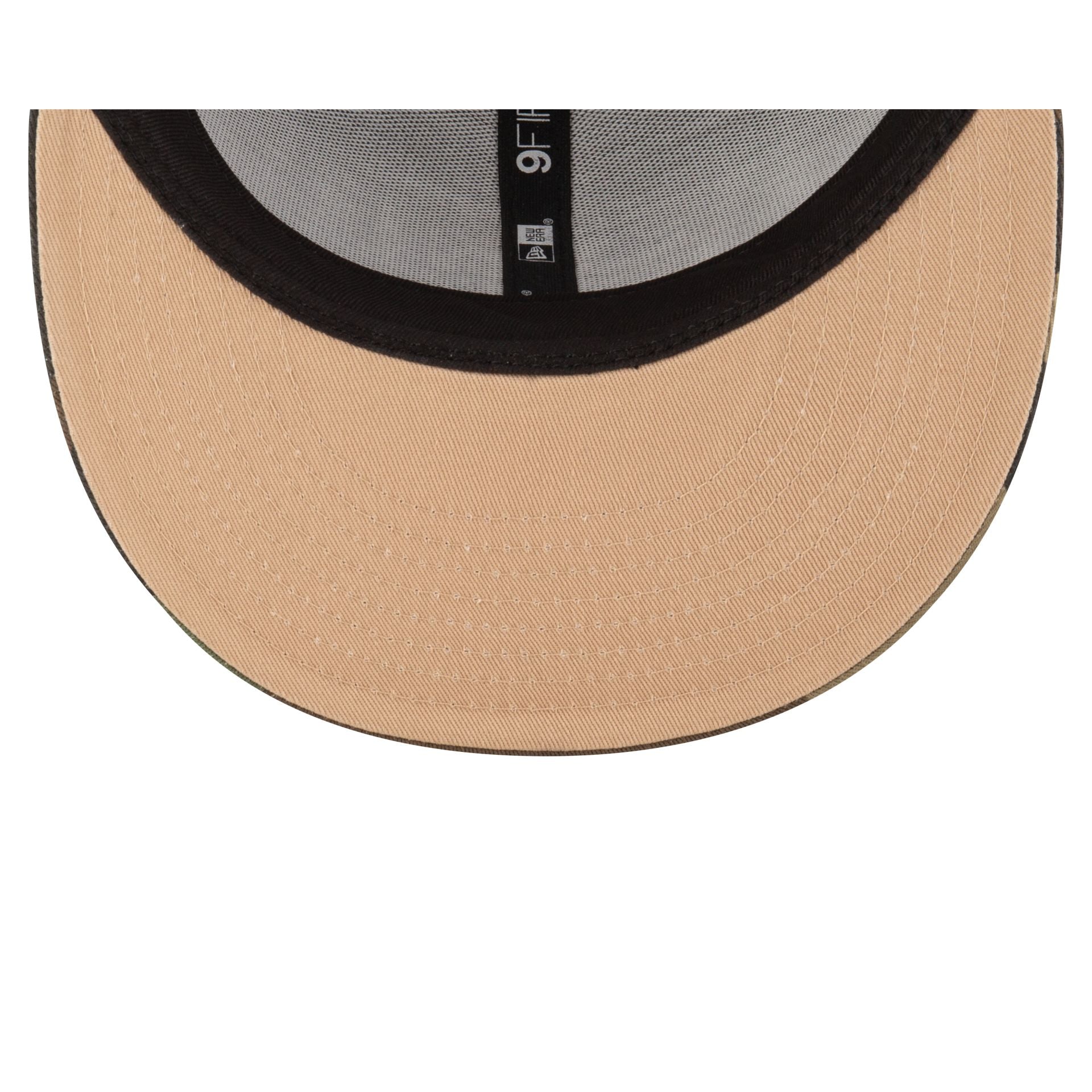 The Notre Dame Fighting Irish Camo 9FIFTY Trucker Hat features an embroidered Fighting Irish logo at the front panels. Additional details include an alternate logo above a snapback closure at the rear and a beige undervisor.