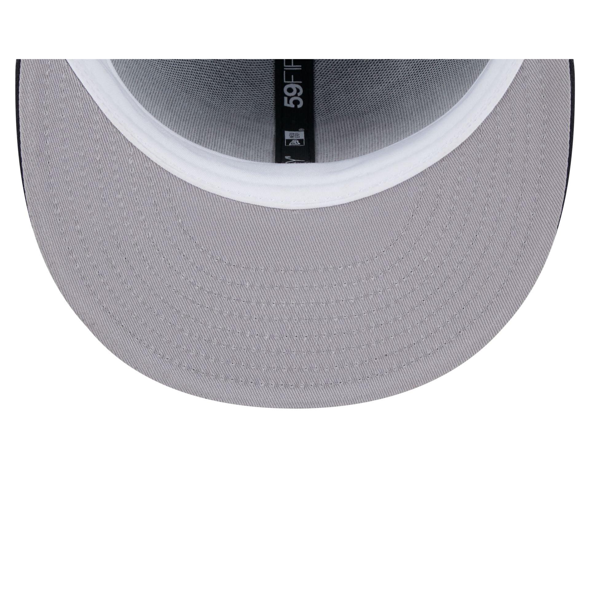 The Notre Dame Fighting Irish Navy 59FIFTY Fitted Cap features an embroidered Fighting Irish logo at the front panels with a matching team wordmark at the rear and a gray undervisor.