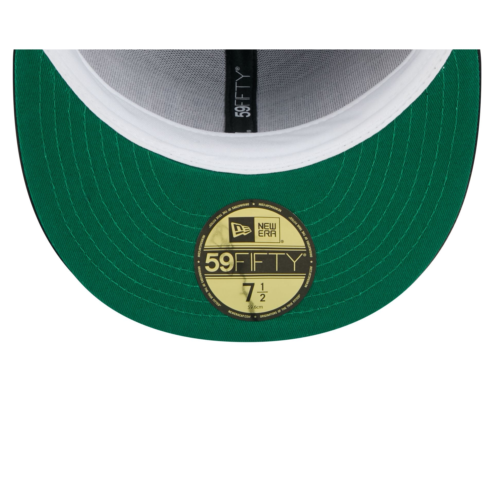 The Orlando Magic Spring Satin 59FIFTY Fitted Cap features an embroidered Magic wordmark at the front panels with a New Era pin at the top left panel and an NBA Logoman at the rear. Additional details include a satin fabrication throughout. a logo at the right-wear side. and a green undervisor.