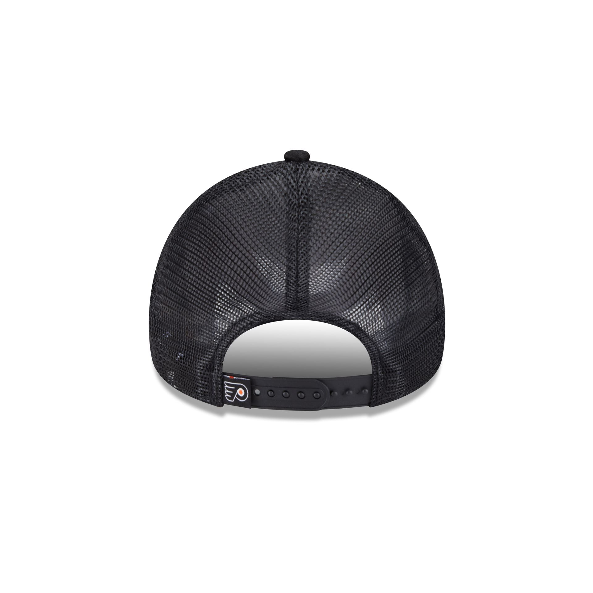 The Philadelphia Flyers Distressed 9FORTY A-Frame Trucker features a distressed screen-printed Flyers wordmark and logo at the front panels with a team tag at a snapback closure at the rear and a green undervisor.
