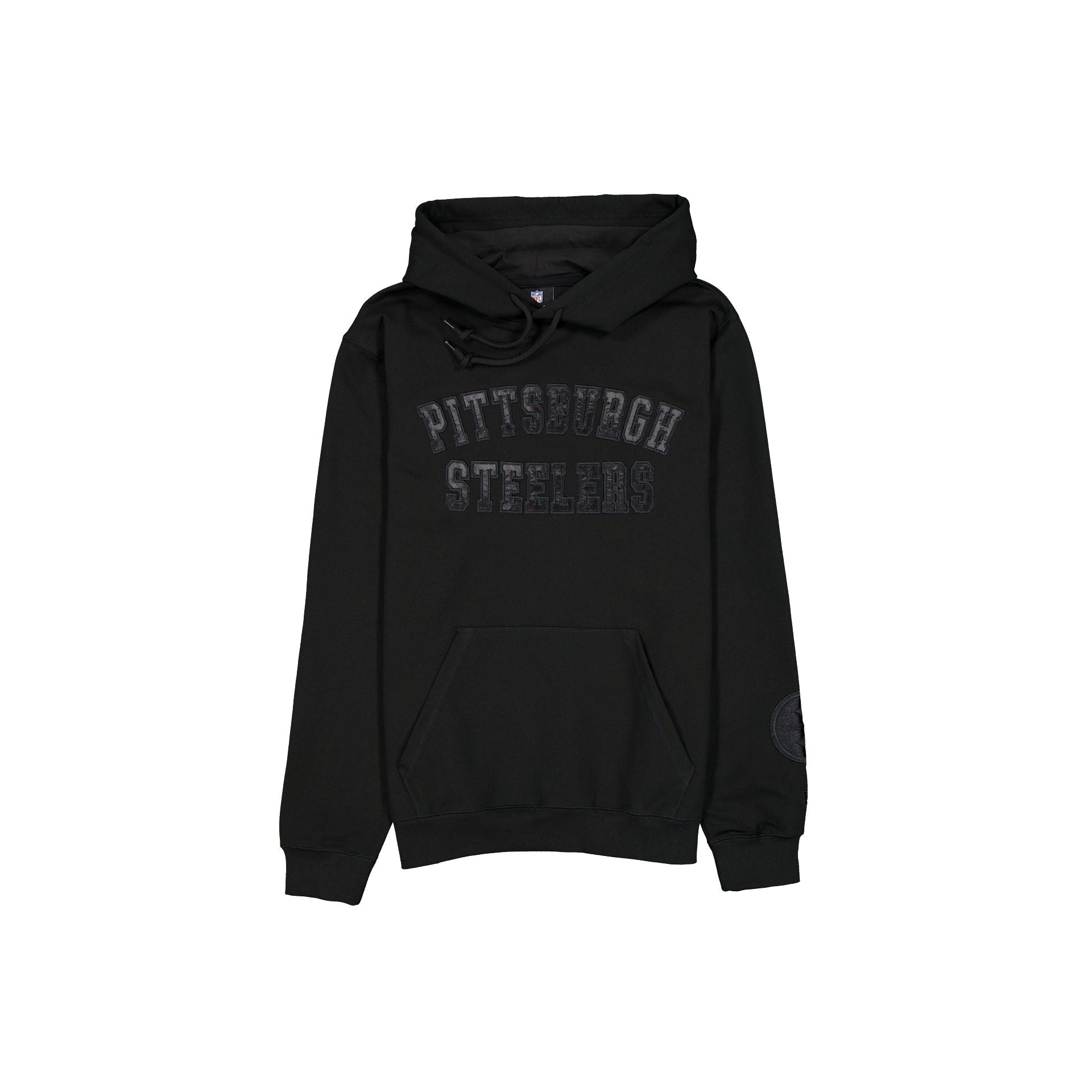 The Pittsburgh Steelers Black on Black Logo Select Hoodie features a satin applique with a tonal stitch Steelers wordmark at the chest and an embroidered team logo at the left-wear sleeve.