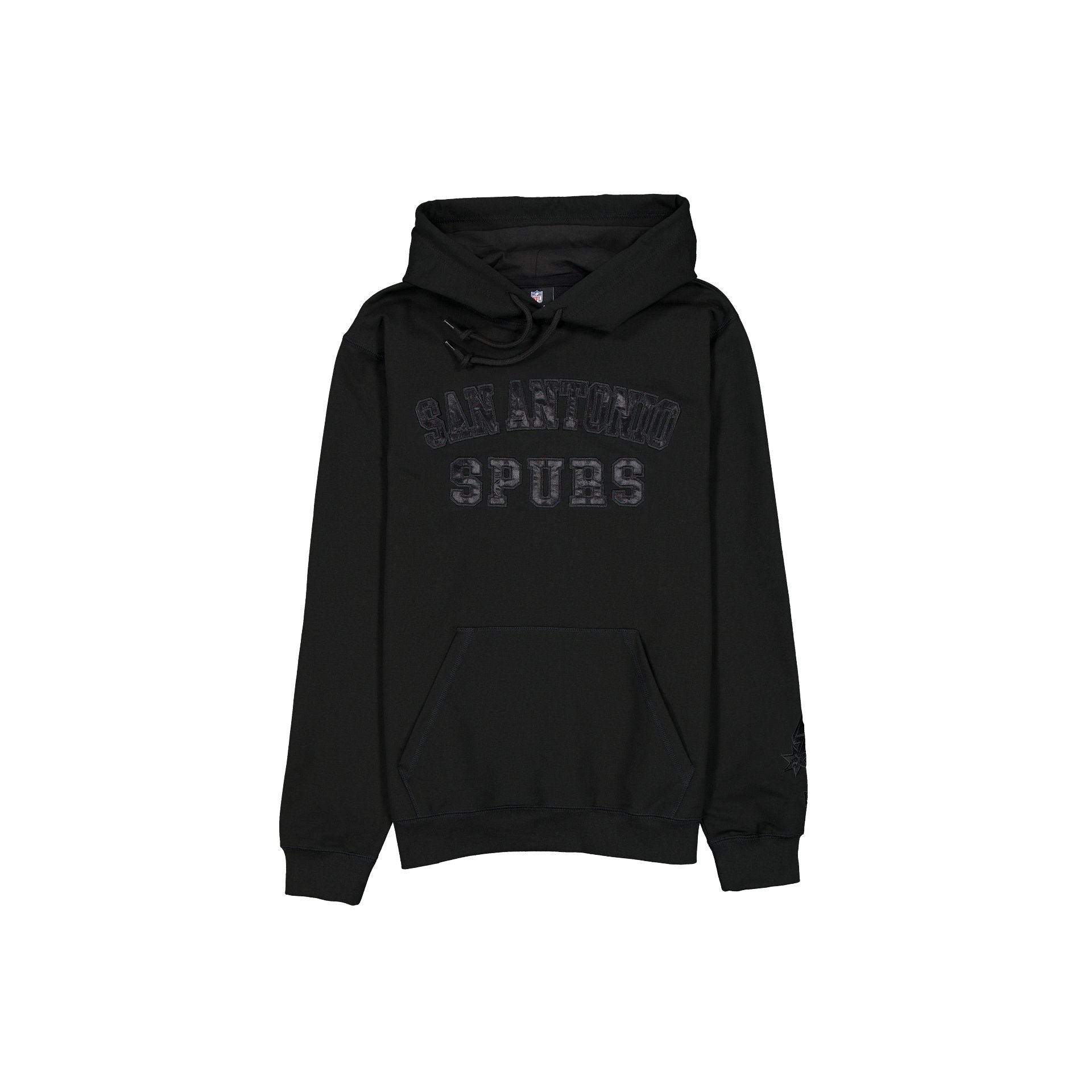 The San Antonio Spurs Black on Black Logo Select Hoodie features a satin applique with a tonal stitch Spurs wordmark at the chest and an embroidered team logo at the left-wear sleeve.
