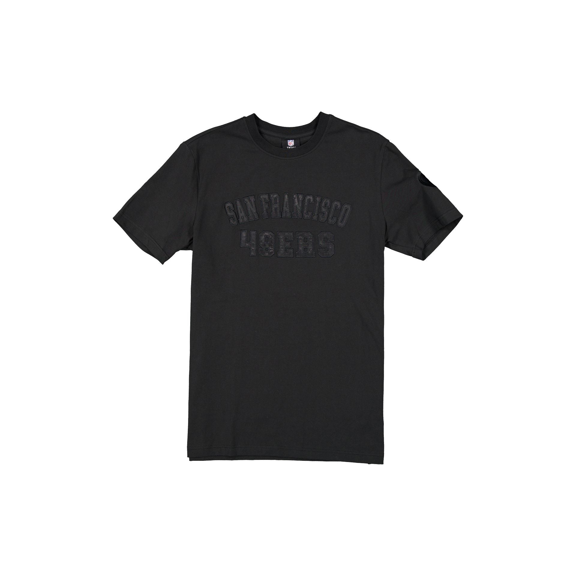 The San Francisco 49ers Black on Black Logo Select T-Shirt features a satin applique with a tonal stitch 49ers wordmark at the chest and an embroidered team logo at the left-wear sleeve.
