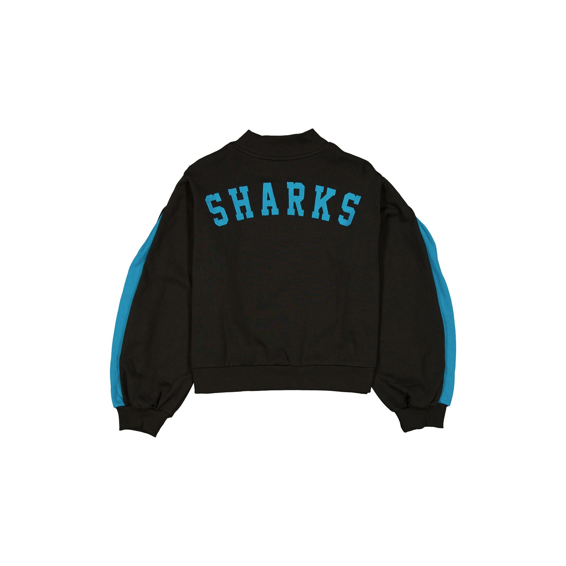 The San Jose Sharks Sport Night Women’s Mockneck features an embroidered Sharks logo at the front chest with a script wordmark at the neck and a wordmark at the rear.
