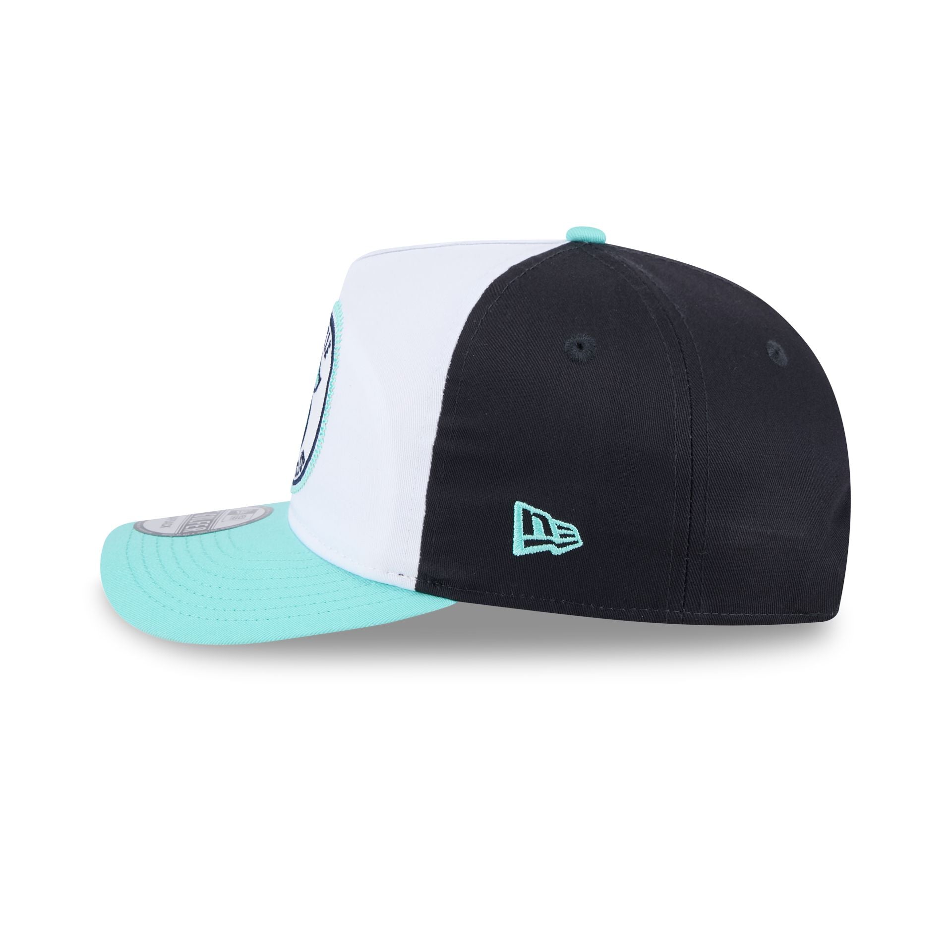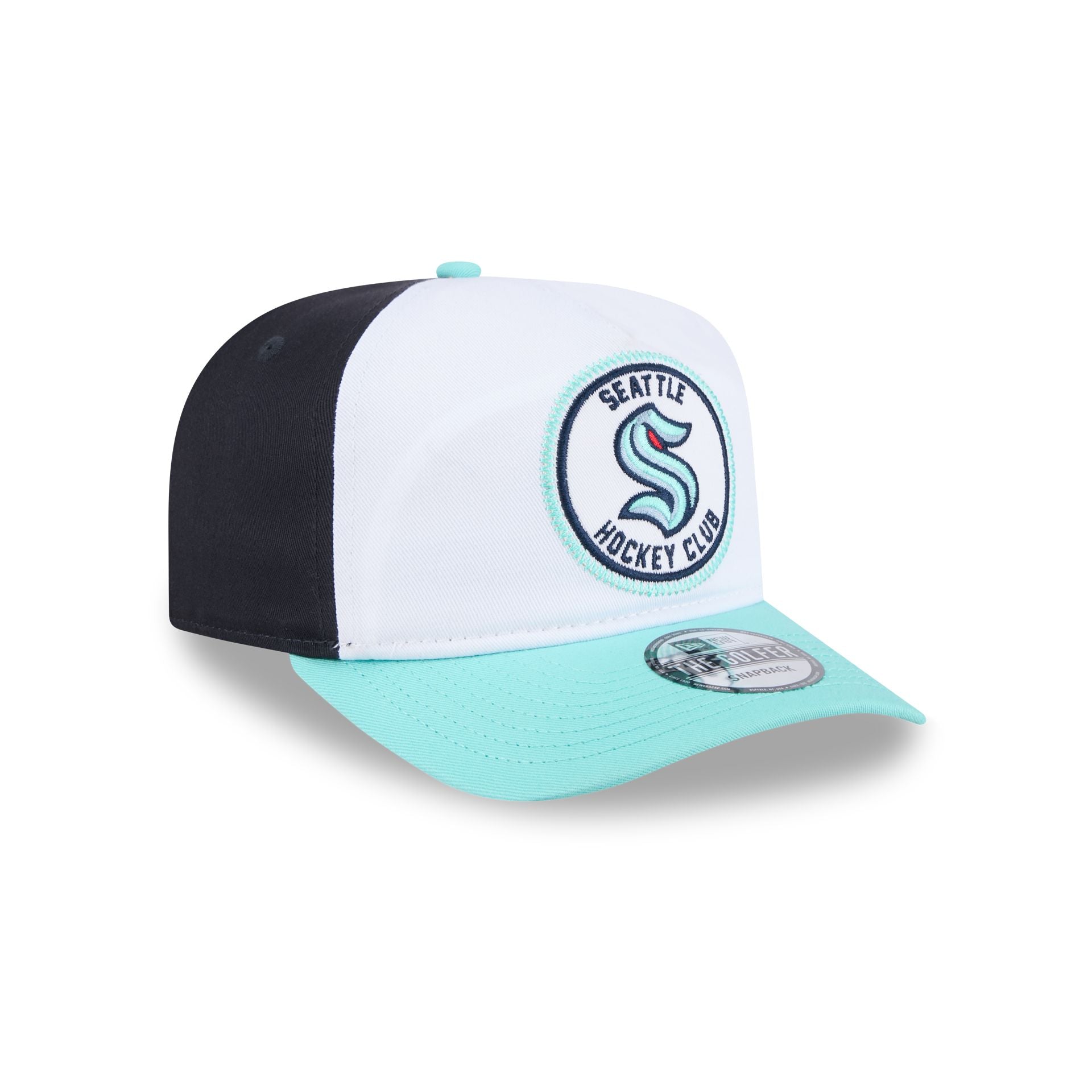 The Seattle Kraken NHL Pack Golfer features a Kraken Hockey Club patch at the front panel with a matching NHL Shield at the right of a snapback closure at the rear and a gray undervisor.