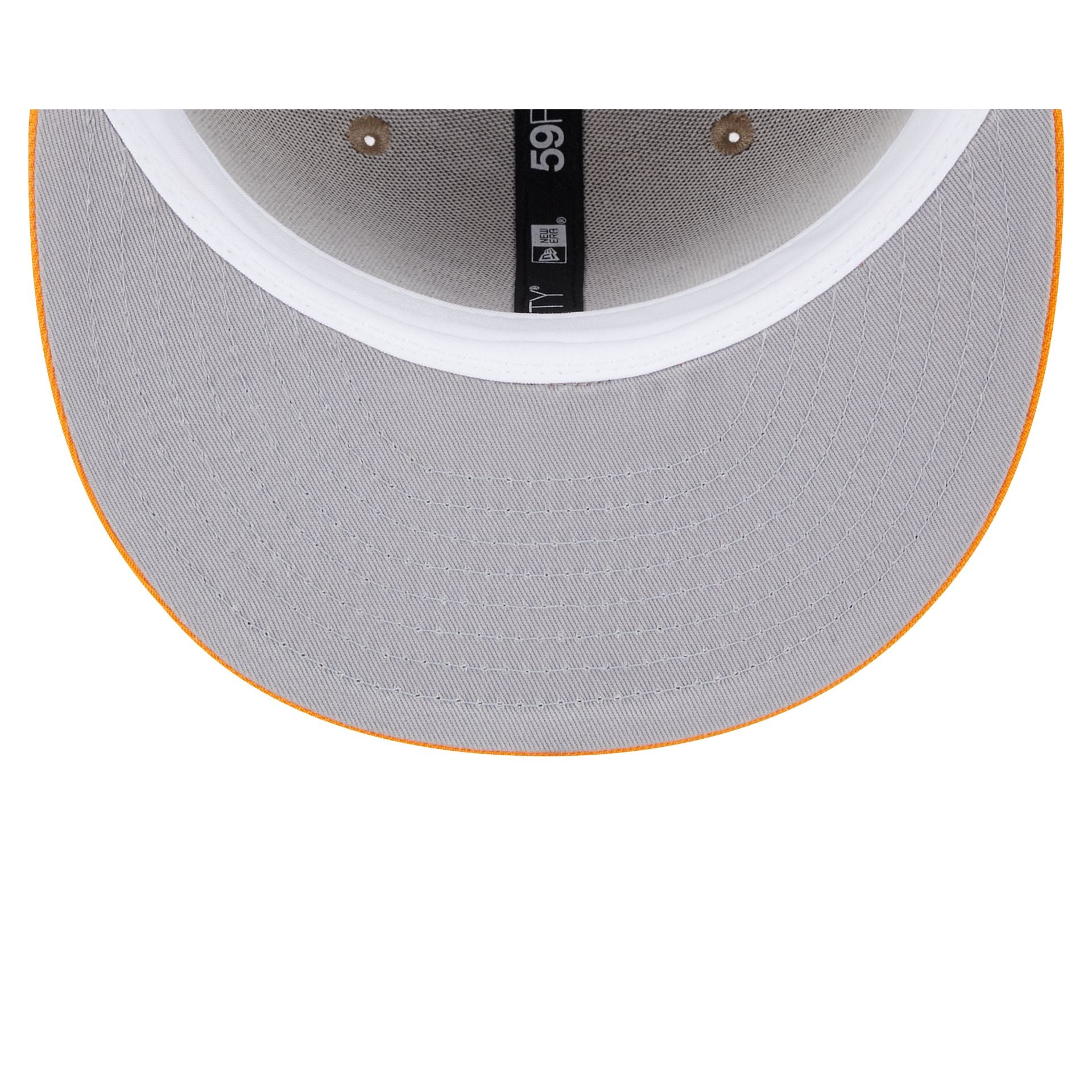 The Tennessee Volunteers Camel College Vault 59FIFTY Fitted Cap features an embroidered Volunteers logo at the front panels with a matching team wordmark at the rear and a gray undervisor.