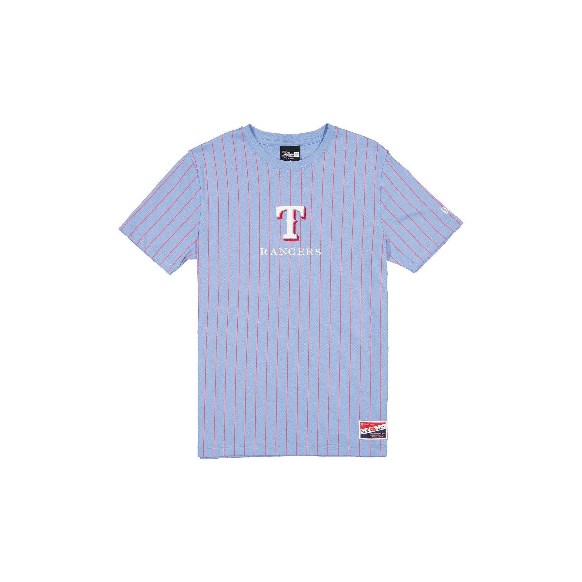 The Texas Rangers Throwback Pinstripe T-Shirt features an embroidered Rangers logo and wordmark at the front with a New Era jock tag at the left hip.