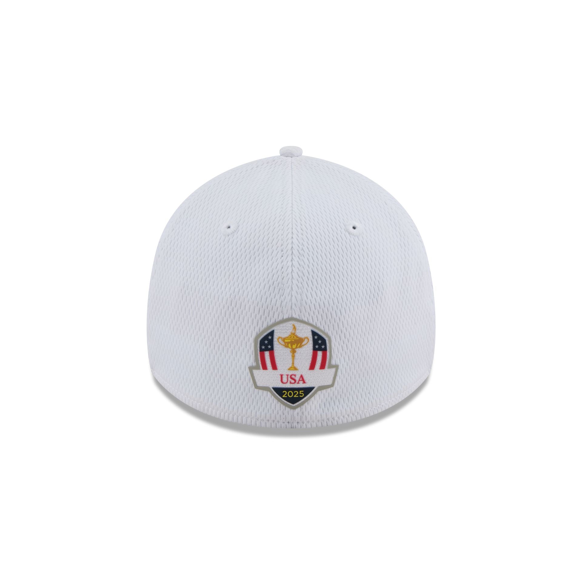 The 2025 Ryder Cup Team USA White 39THIRTY Stretch Fit features an embroidered Team USA logo at the front panels with a silicone Ryder Cup logo at the rear. Additional details include Ryder Cup pin flag at the front left panel and a gray undervisor.