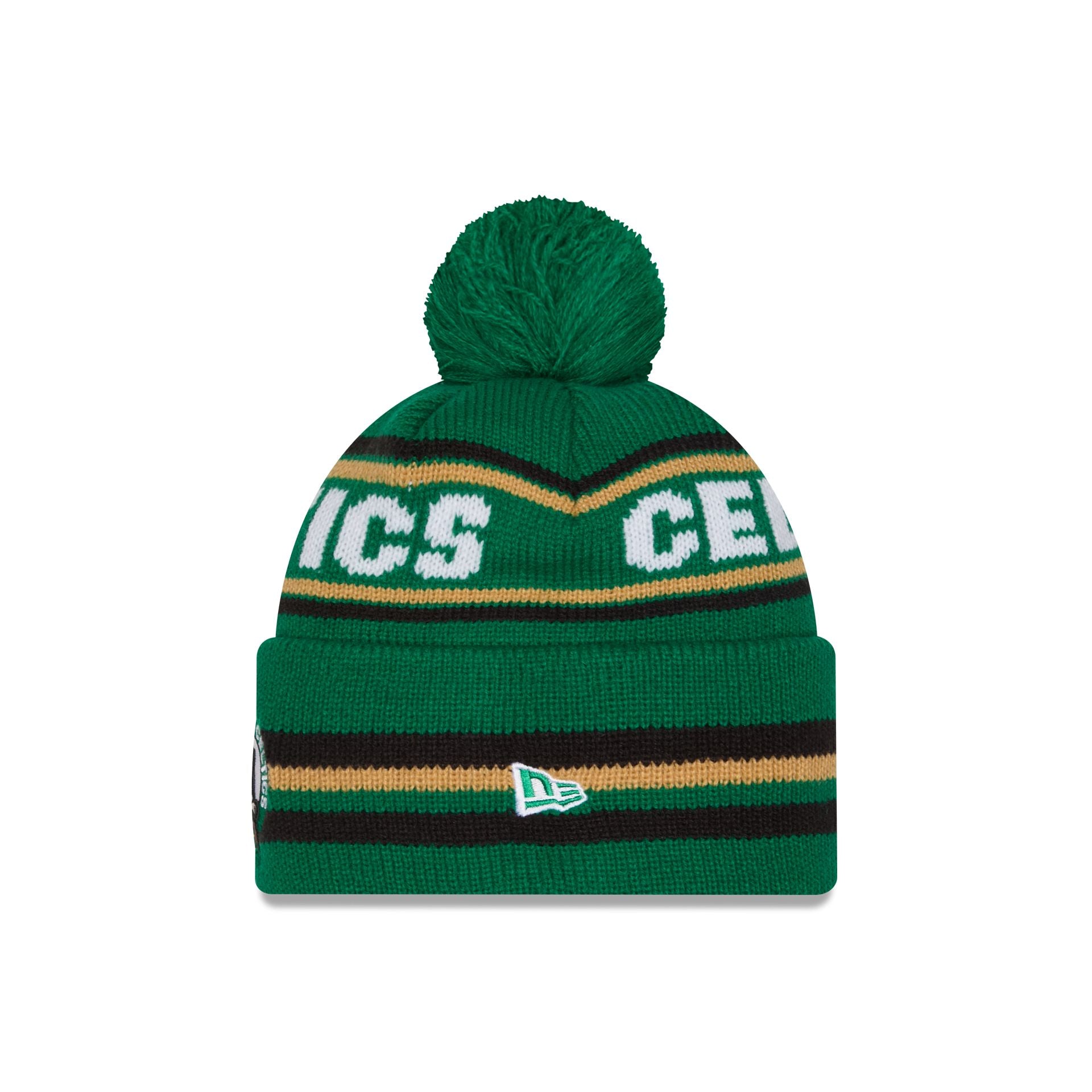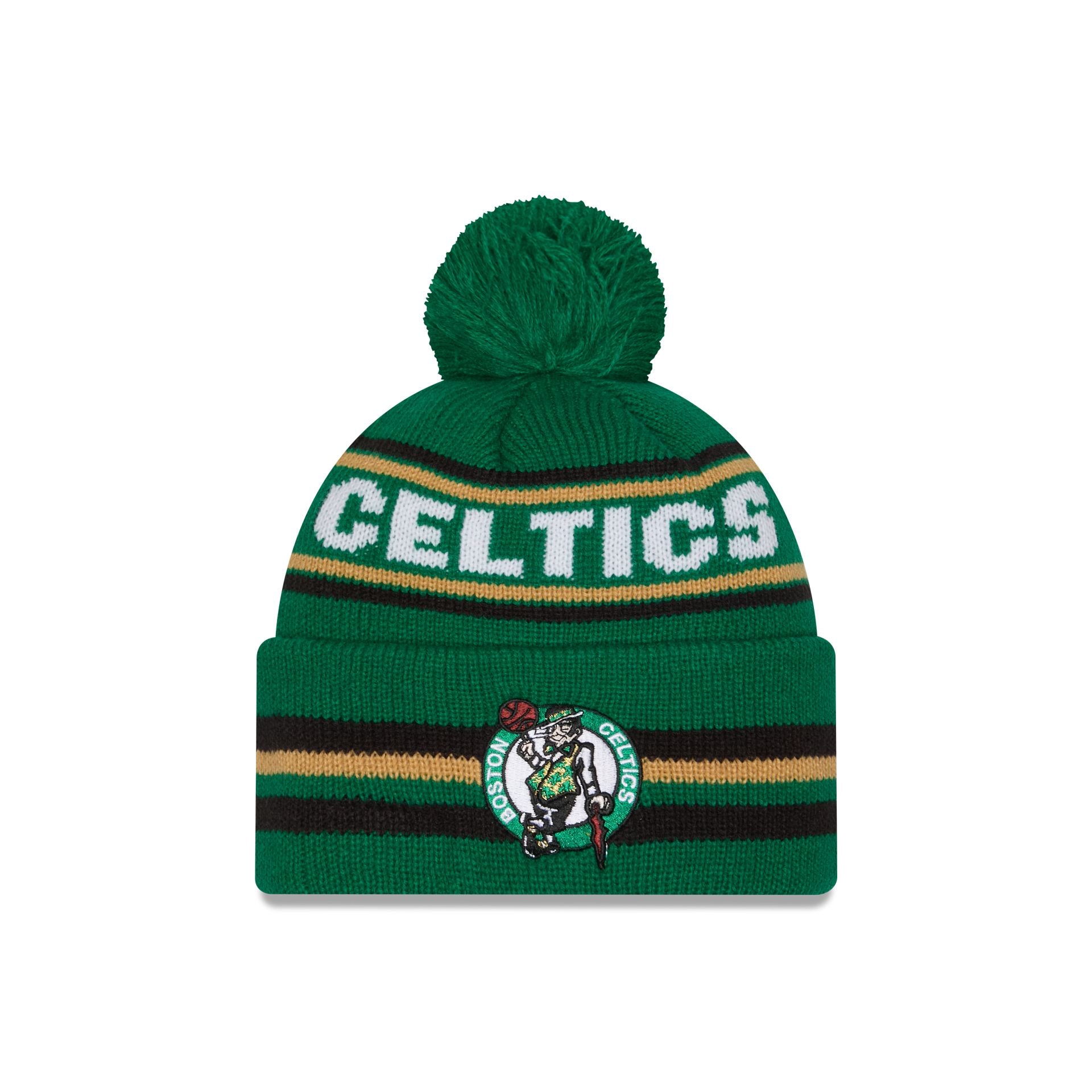 The Boston Celtics Classic Pom Knit Hat features an embroidered Celtics logo at the front cuff with a wordmark at the crown and a one-time removable pom.