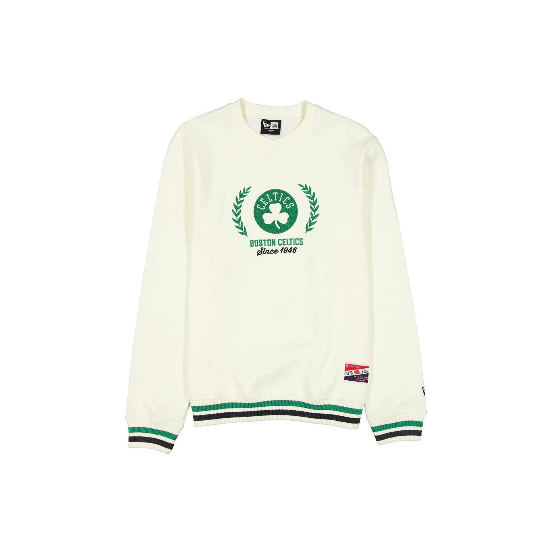 The Boston Celtics Throwback Chrome White Crewneck features a twill applique Celtics logo and an embroidered wordmark at the front with a New Era jock tag at the left hip.