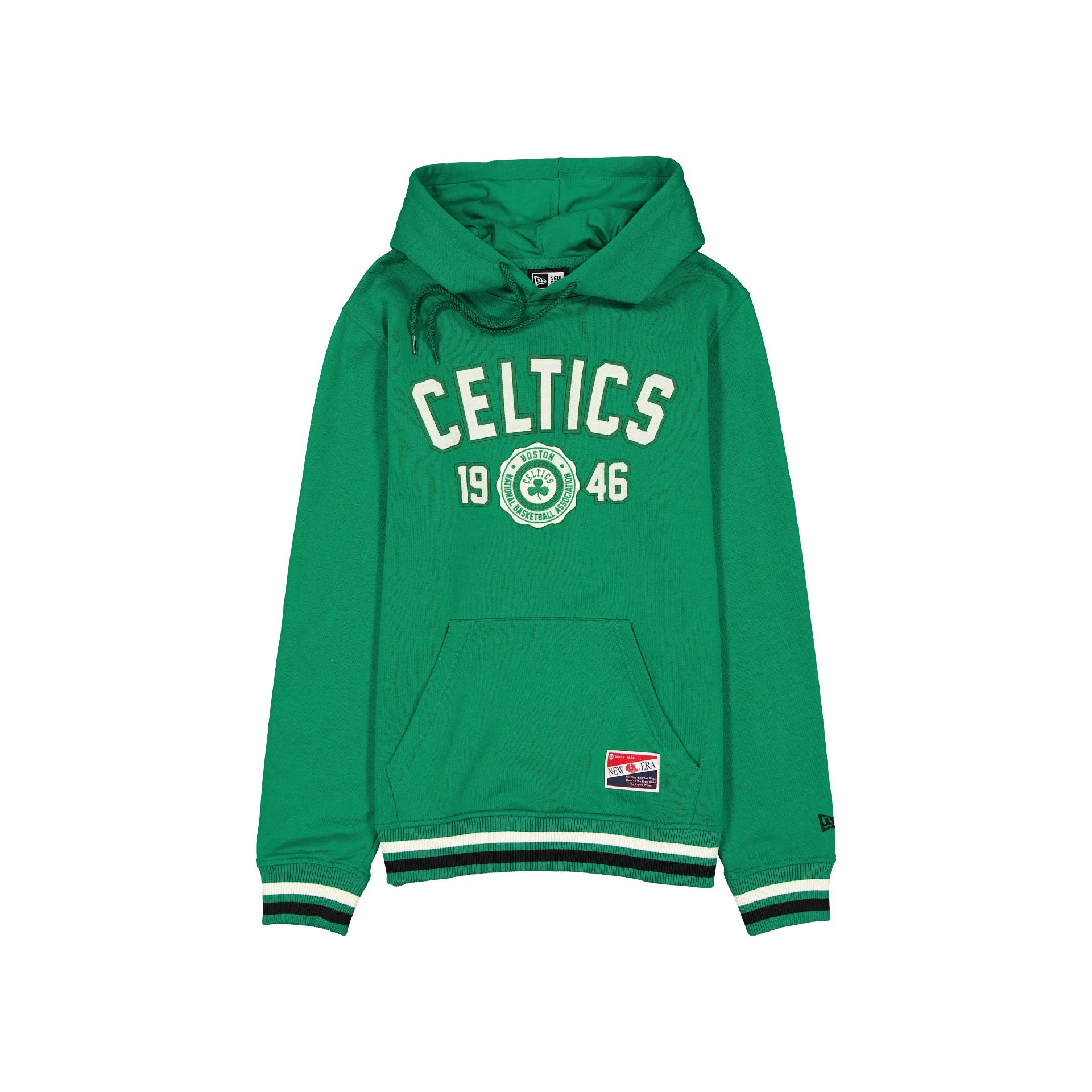 The Boston Celtics Throwback Hoodie features a felt applique Celtics wordmark at the front with kangaroo pockets. adjustable drawstrings at the hood. and a New Era jock tag at the left pocket.
