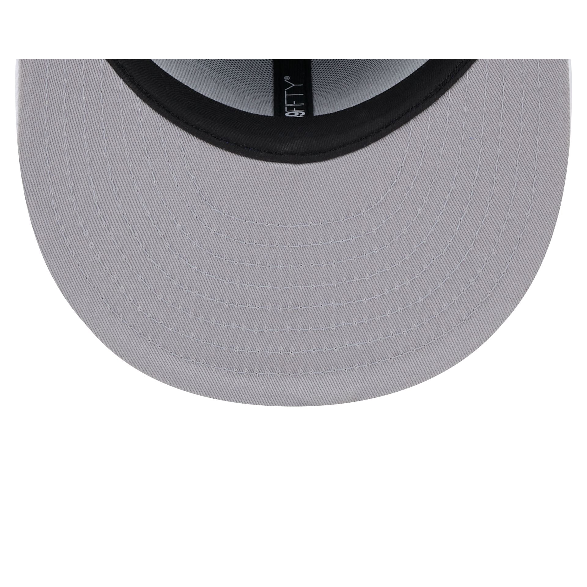 The Boston Red Sox Wave Fill 59FIFTY Fitted Cap features an embroidered wave fill Red Sox wordmark at the front panels with a matching MLB Batterman logo at the rear. Additional details include a jacquard crown. a white visor. and a gray undervisor.