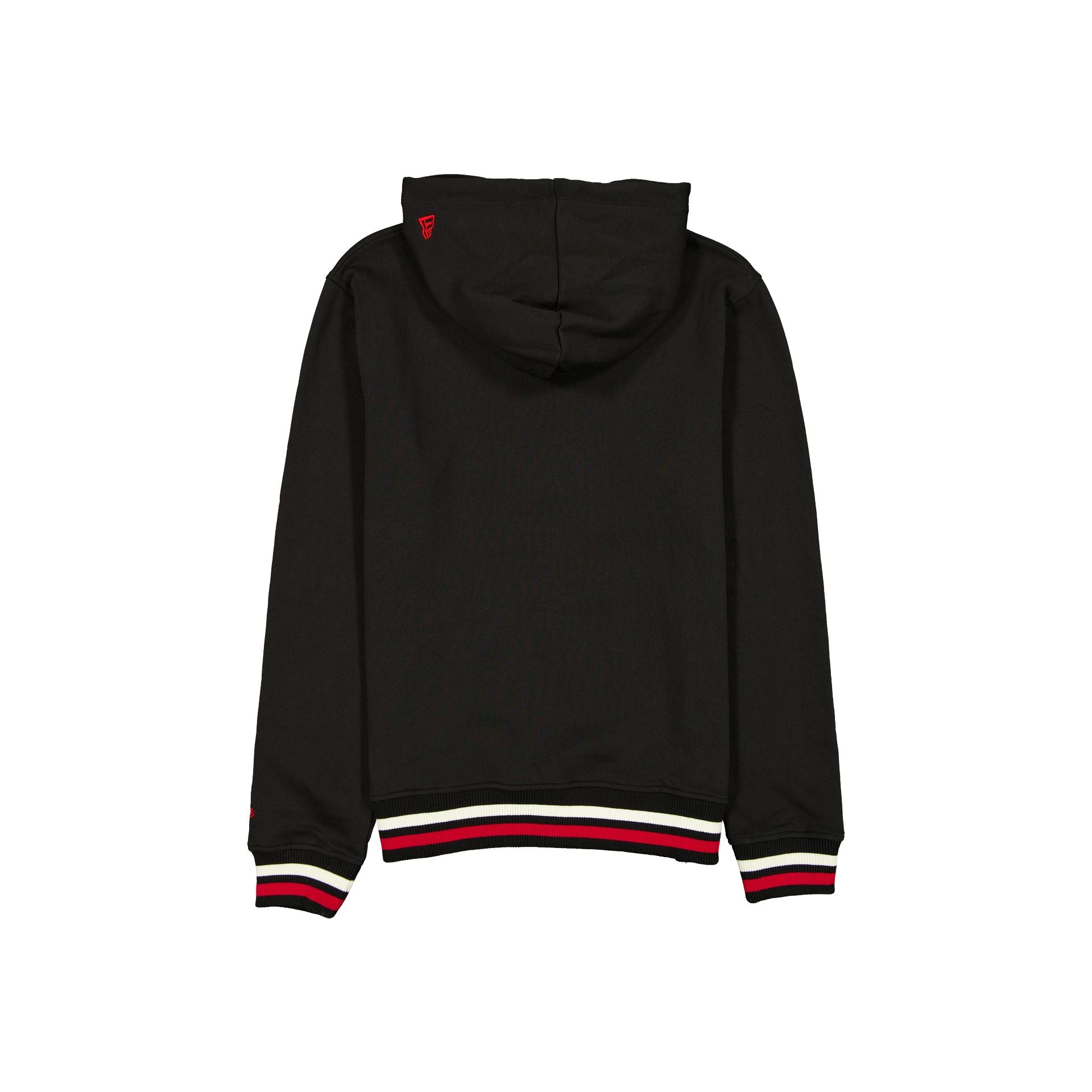 The Chicago Bulls Throwback Hoodie features a felt applique Bulls wordmark at the front with kangaroo pockets. adjustable drawstrings at the hood. and a New Era jock tag at the left pocket.