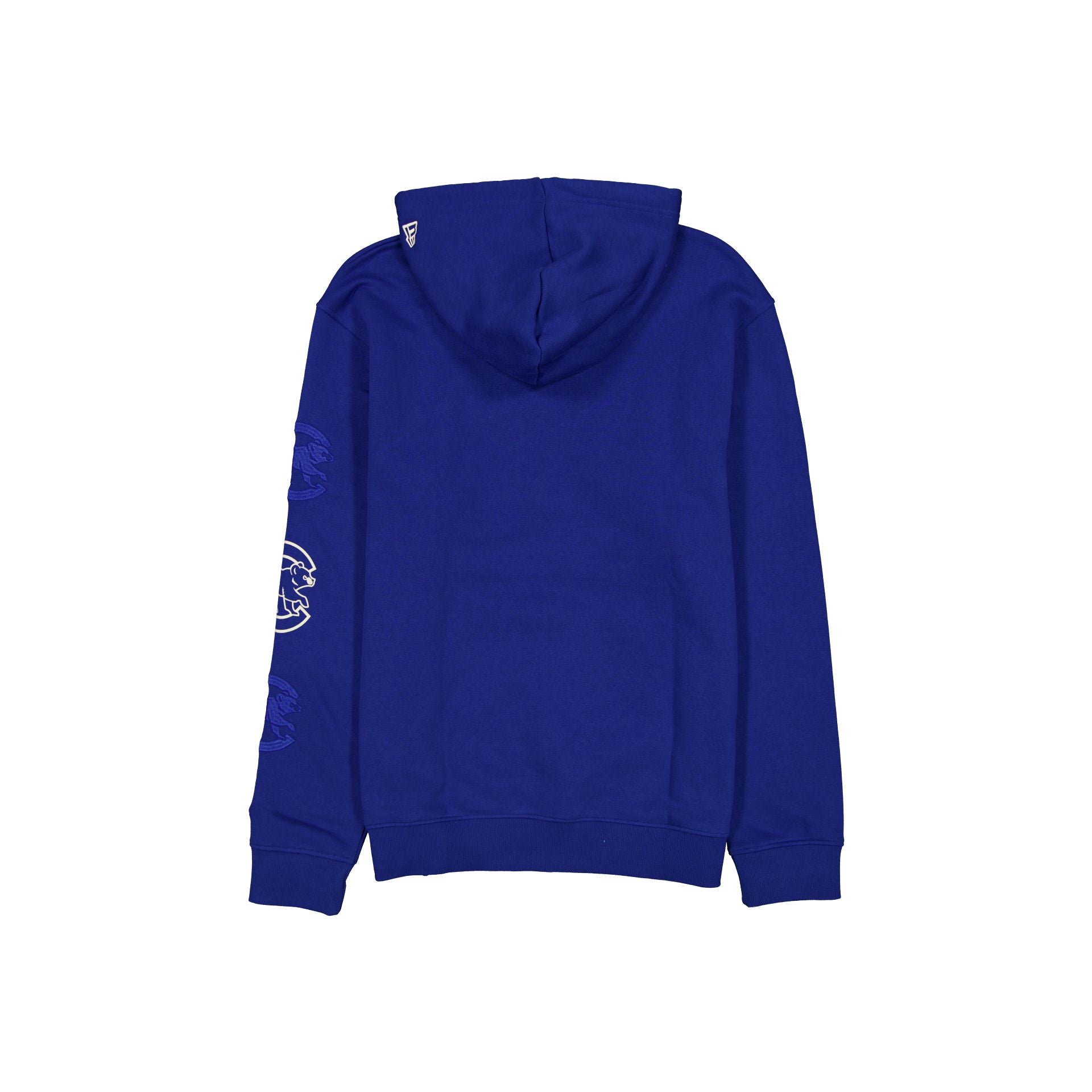 The Chicago Cubs Overlay Blue Hoodie features an embroidered Cubs logo above a screen-printed wordmark at the front. Additional details include a logo at a kangaroo pocket and adjustable drawstrings at the hood.
