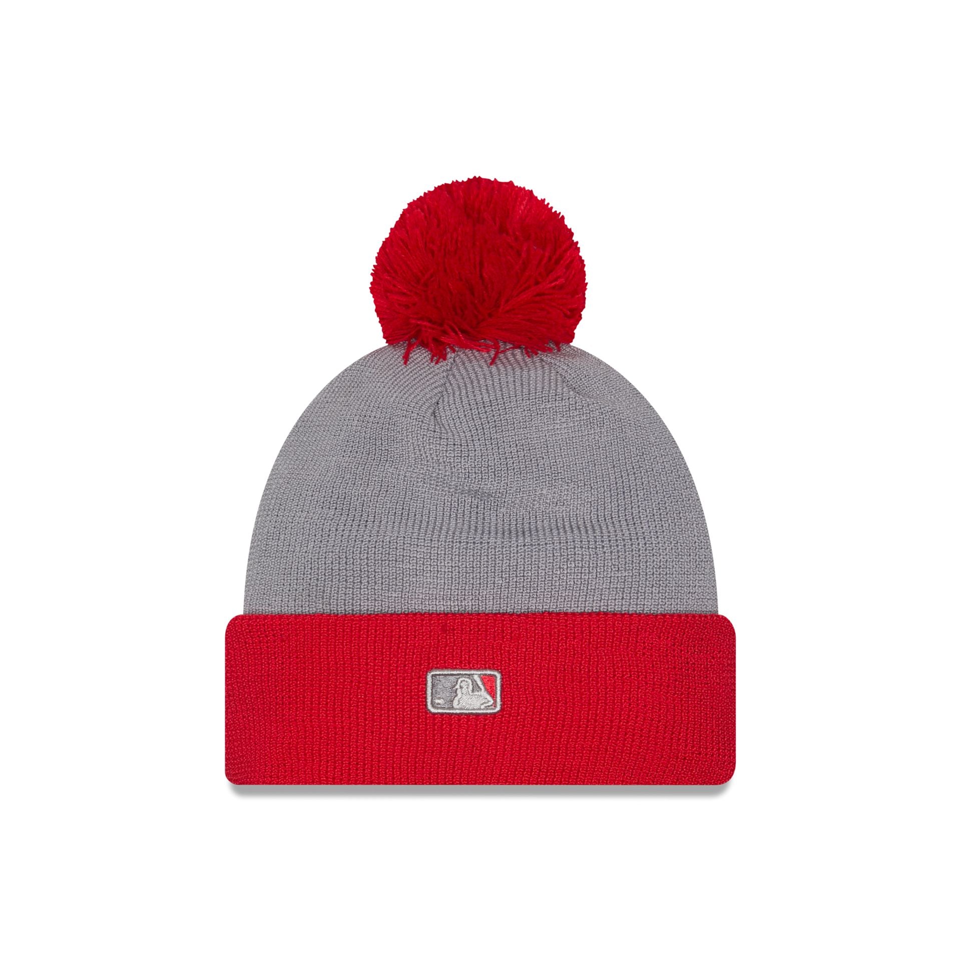 The Chicago White Sox 2025 Batting Practice Pom Knit Hat features an embroidered White Sox logo at the front cuff with a matching MLB Batterman logo at the rear. Additional details include a one-time removeable pom.