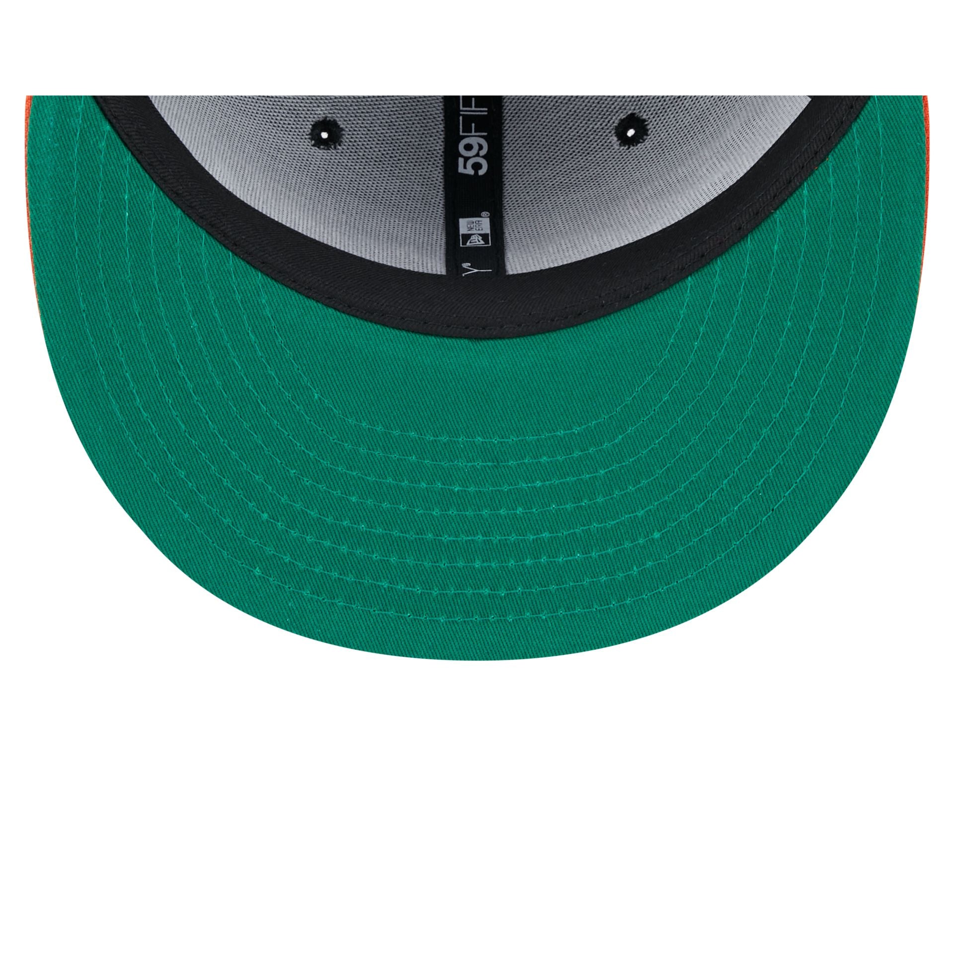 The Cincinnati Bengals Faux Leather Crown 59FIFTY Fitted Cap features an embroidered Bengals wordmark at the front panels with a matching NFL Shield at the rear. an orange visor. and green undervisor.