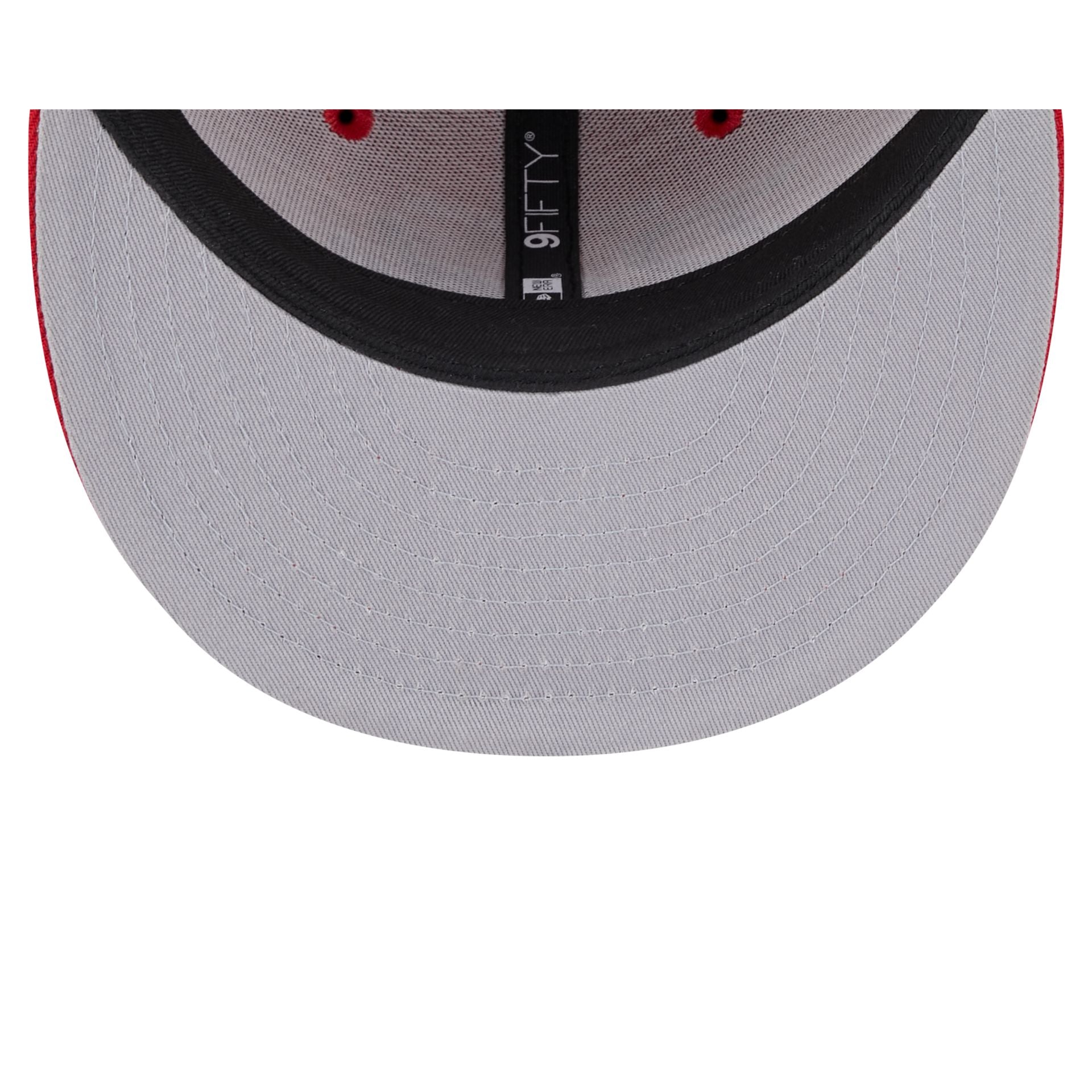 The Cincinnati Reds Kids 9FIFTY Snapback Hat features an embroidered Reds wordmark at the front panels with a matching team logo at the right-wear side. Additional details include a gray undervisor and a snapback closure at the rear.