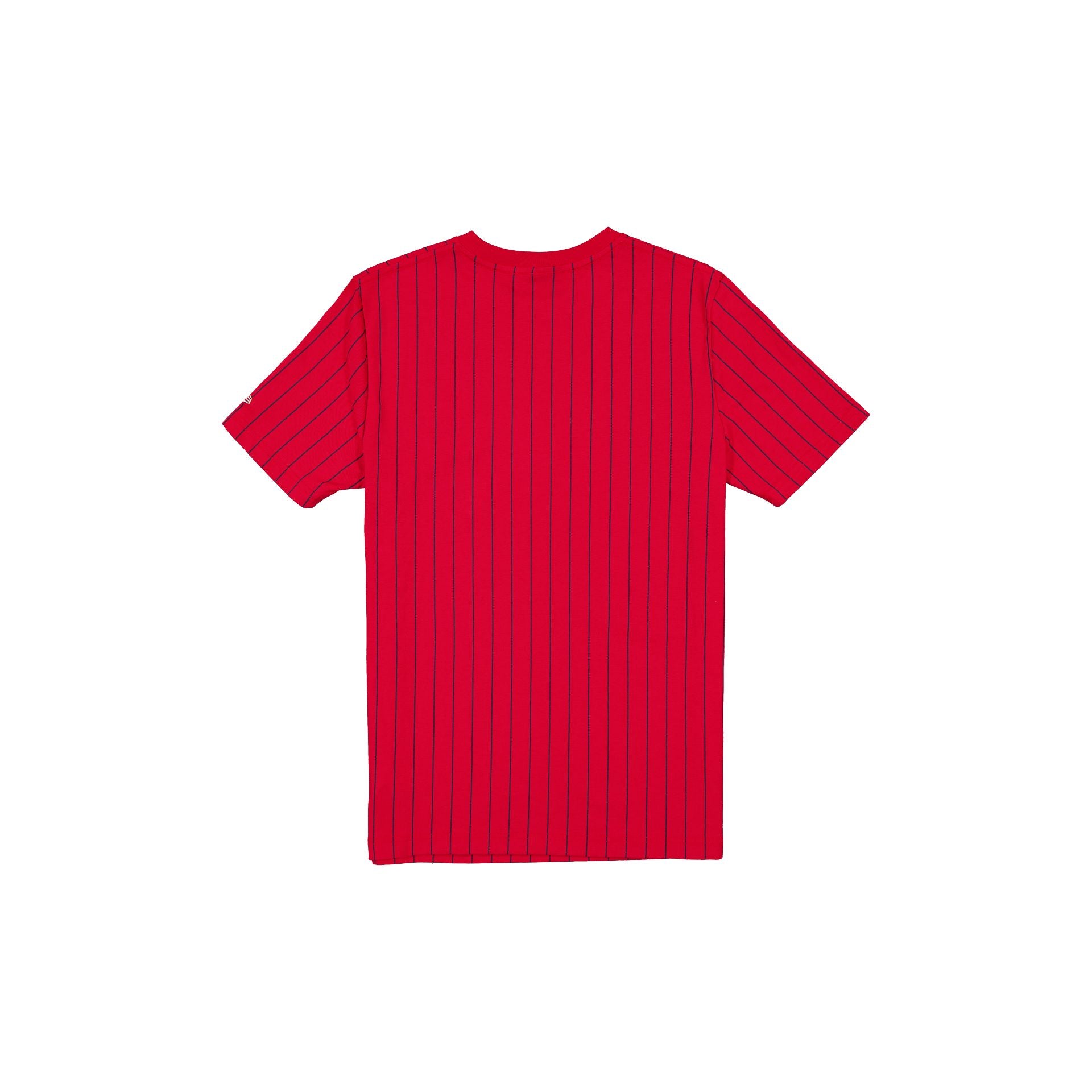 The Cleveland Guardians Throwback Pinstripe T-Shirt features an embroidered Guardians logo and wordmark at the front with a New Era jock tag at the left hip.
