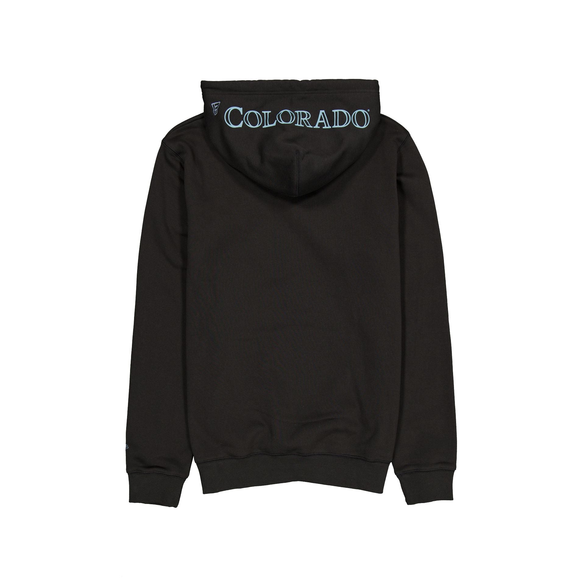The Colorado Rockies Black Realtree Hoodie features an embroidered Rockies reflective ink Realtree applique with kangaroo pockets. blue Realtree lining. and a team wordmark at the hood.