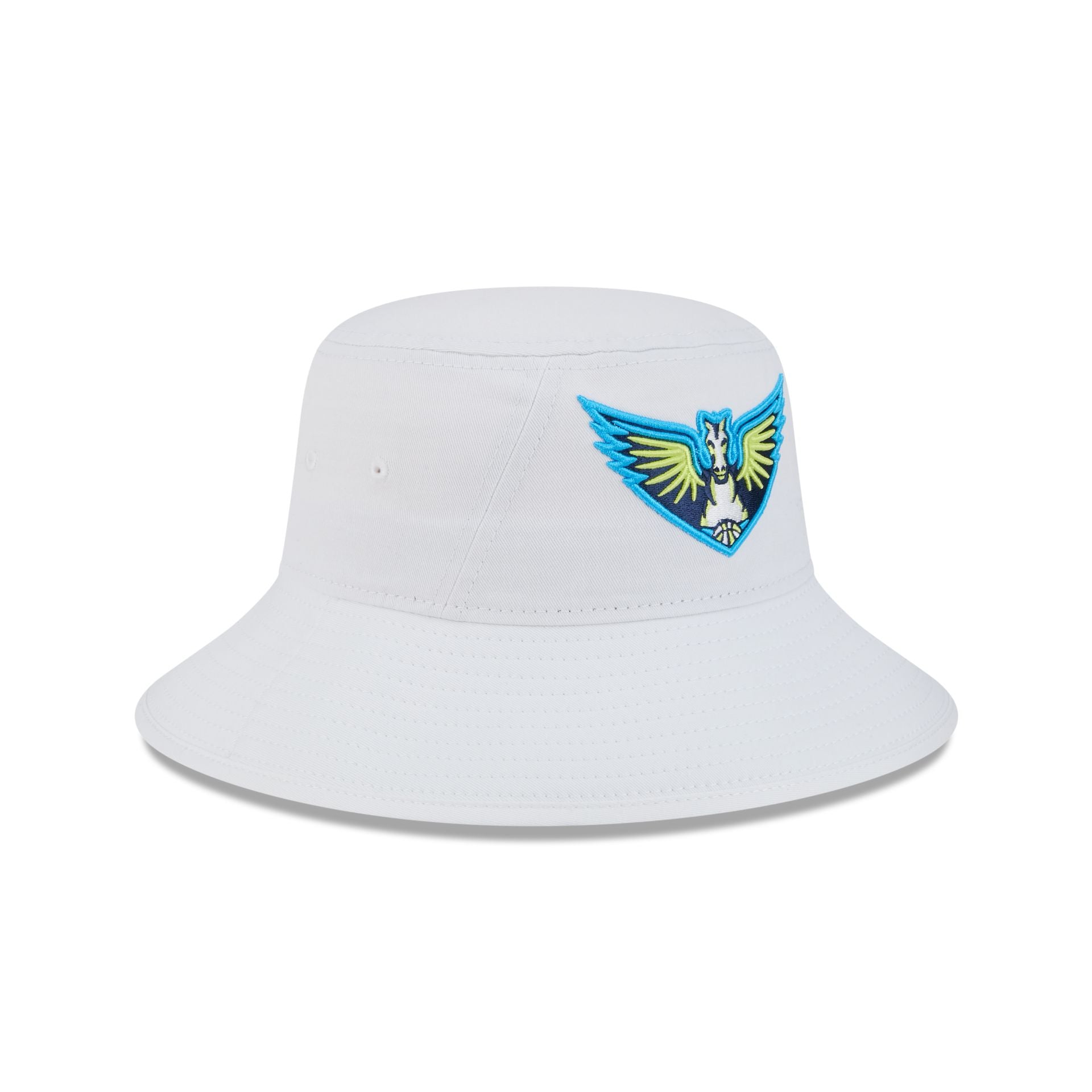 The Dallas Wings Optic White Bucket Hat features an embroidered Wings logo at the front with a matching New Era Flag at the left-wear side.