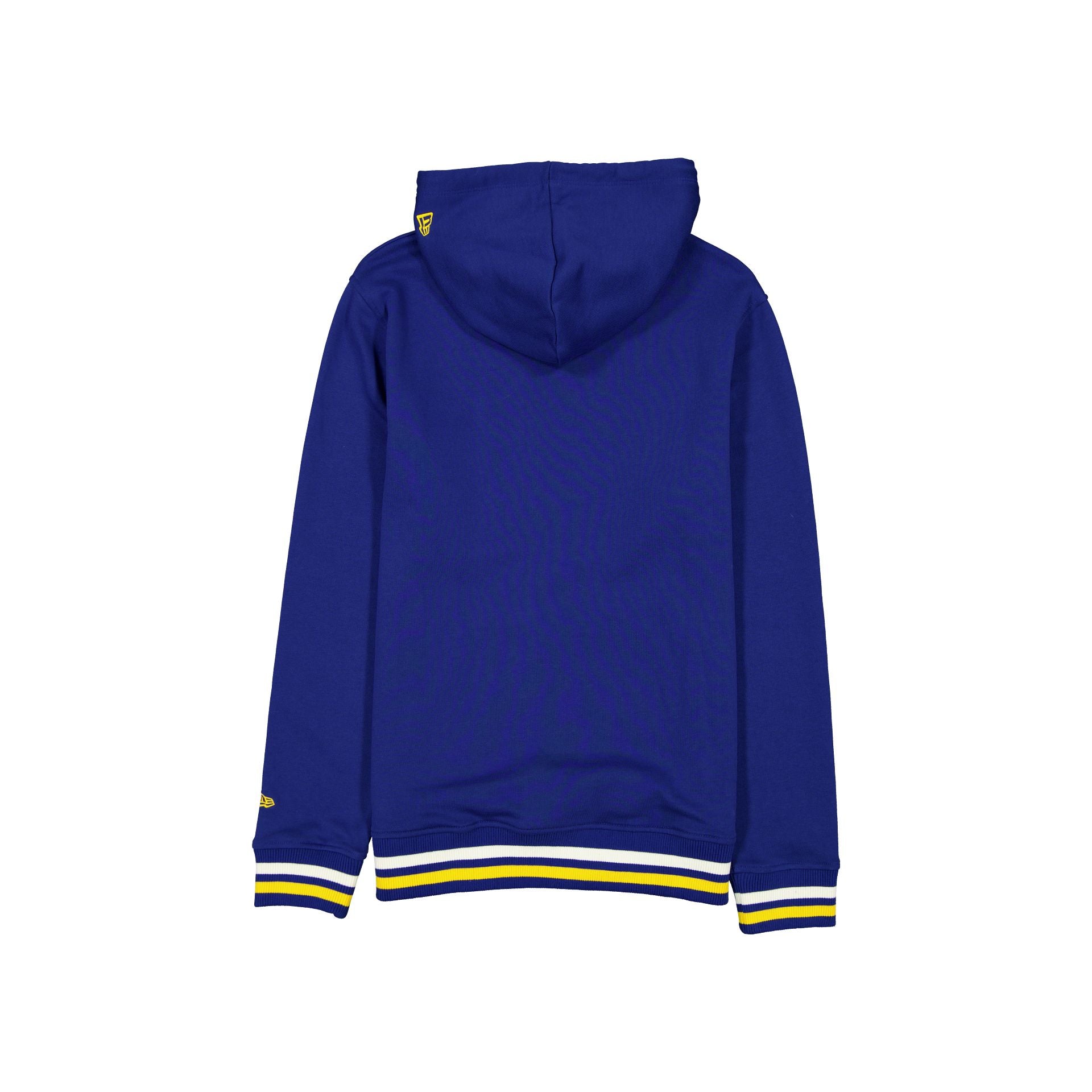 The Golden State Warriors Throwback Hoodie features a felt applique Warriors wordmark at the front with kangaroo pockets. adjustable drawstrings at the hood. and a New Era jock tag at the left pocket.