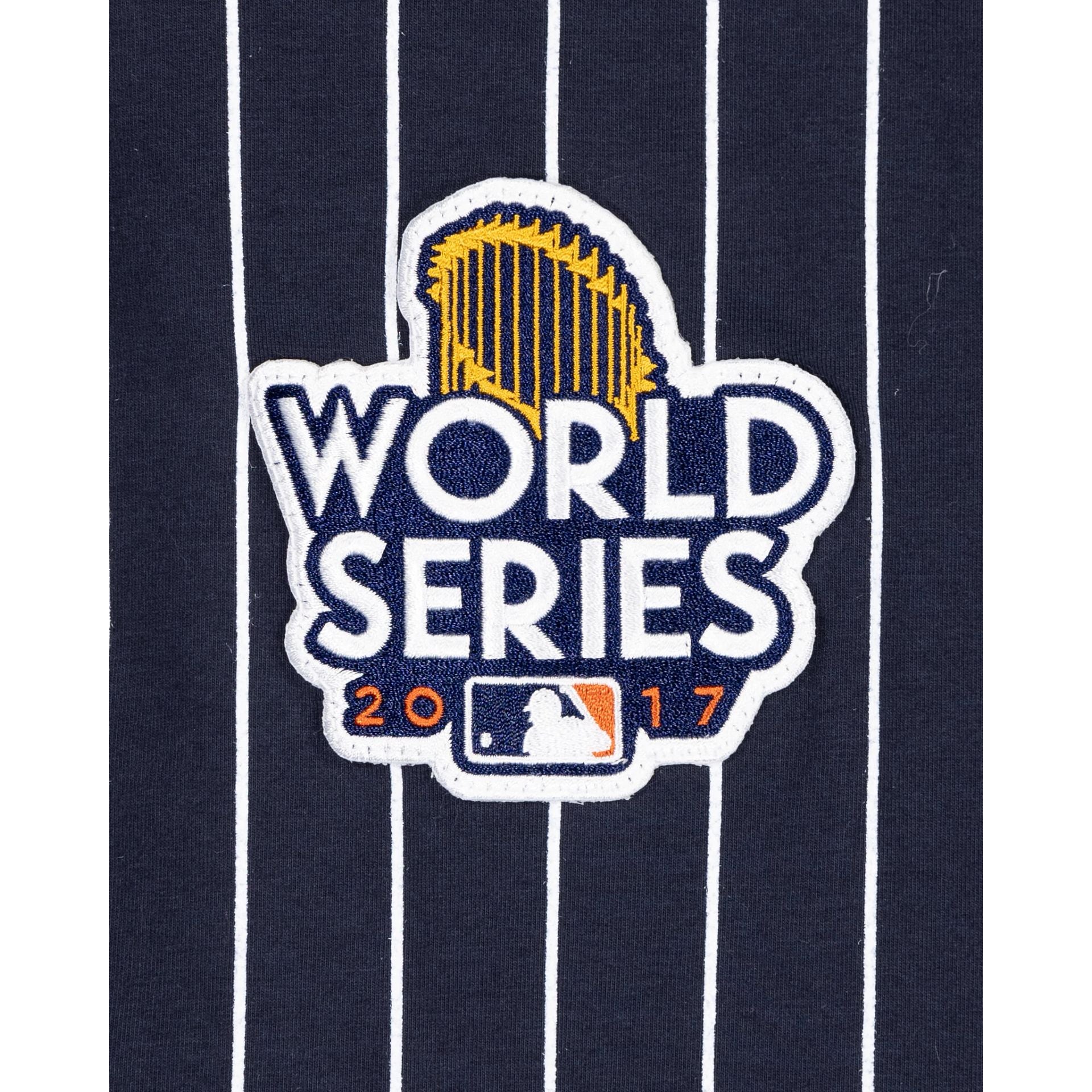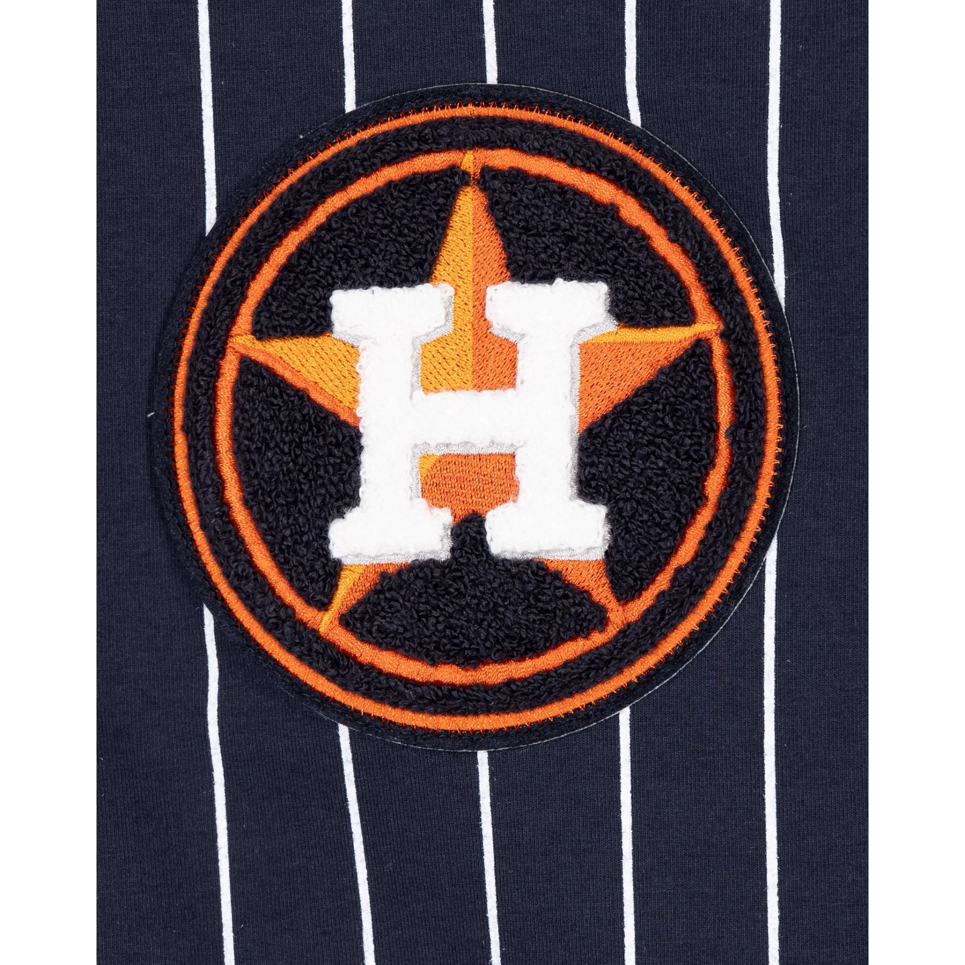 The Houston Astros Logo Select Pinstripe Hoodie features a chenille applique Astros logo at the left chest with team patches at each sleeve and an embroidered team wordmark at the rear.
