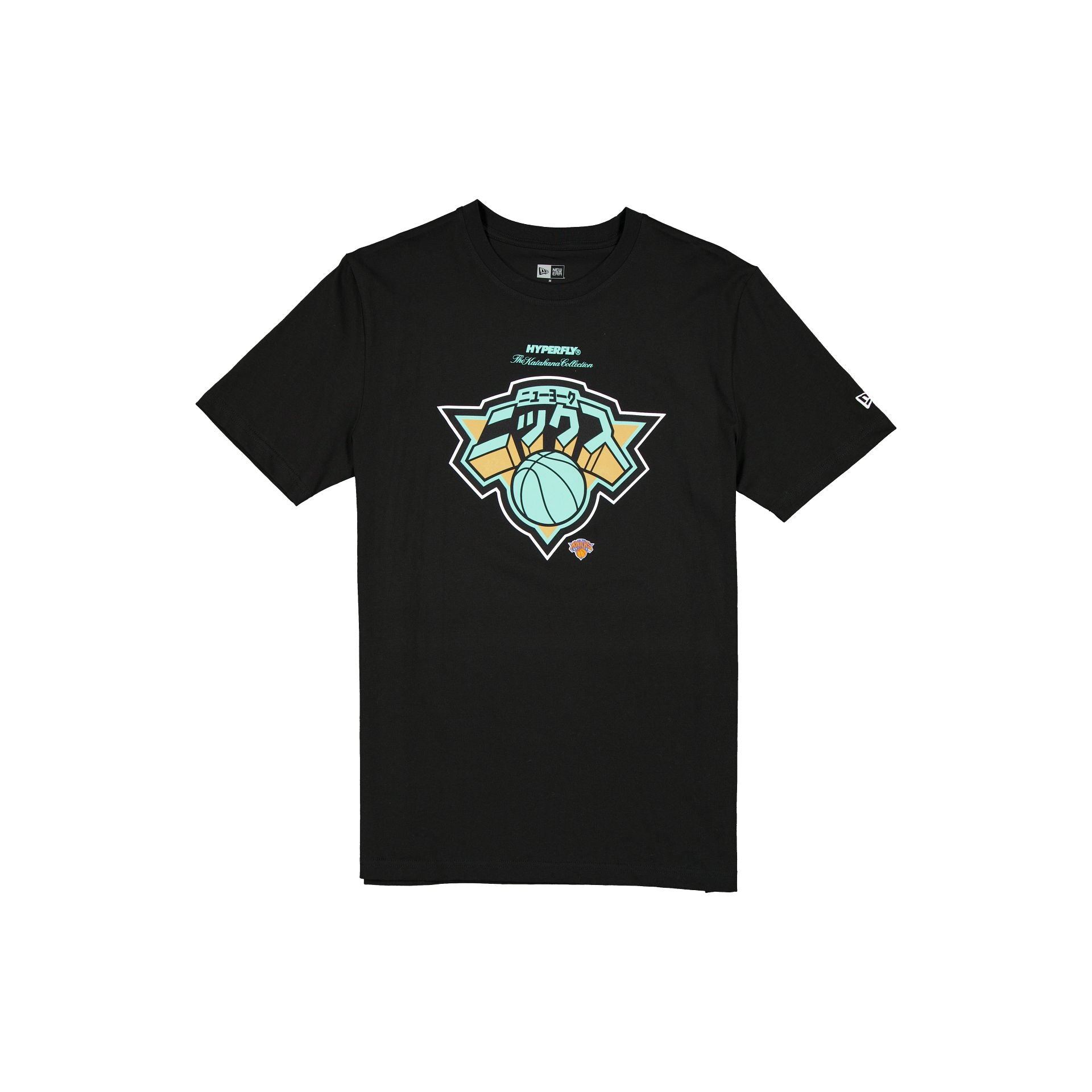 The New York Knicks 2025 All-Star Game T-Shirt features a screen-printed Katakana-themed Knicks graphic at the front.