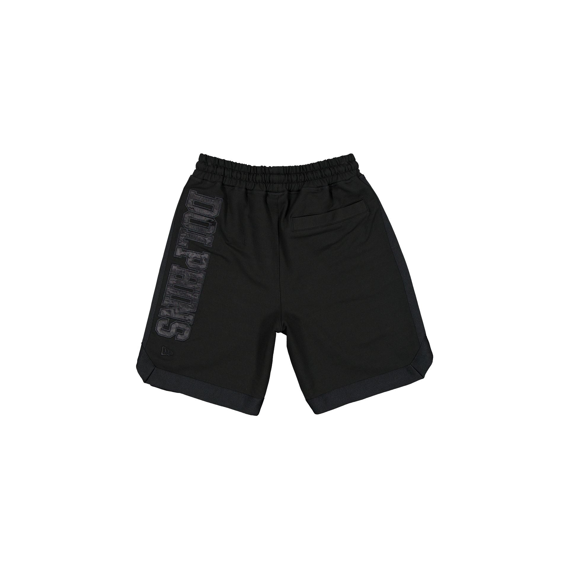 The Miami Dolphins Black on Black Logo Select Shorts features an embroidered Dolphins logo at the right-wear leg and a satin applique with a tonal stitch team wordmark at the rear left leg.