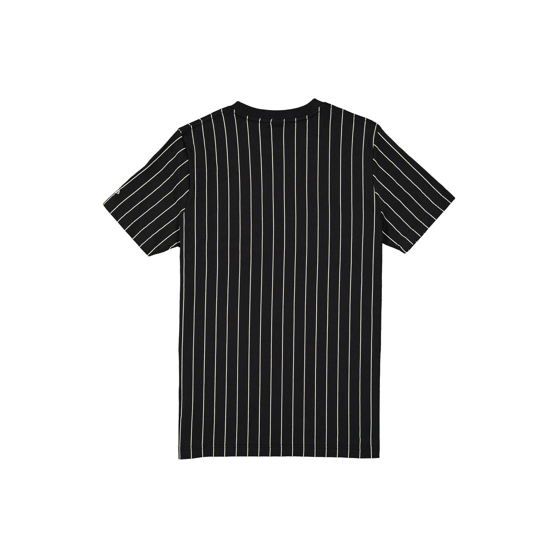 The Miami Marlins Throwback Pinstripe Wordmark T-Shirt features a twill applique Marlins wordmark and logo at the front with a New Era jock tag at the left hip.