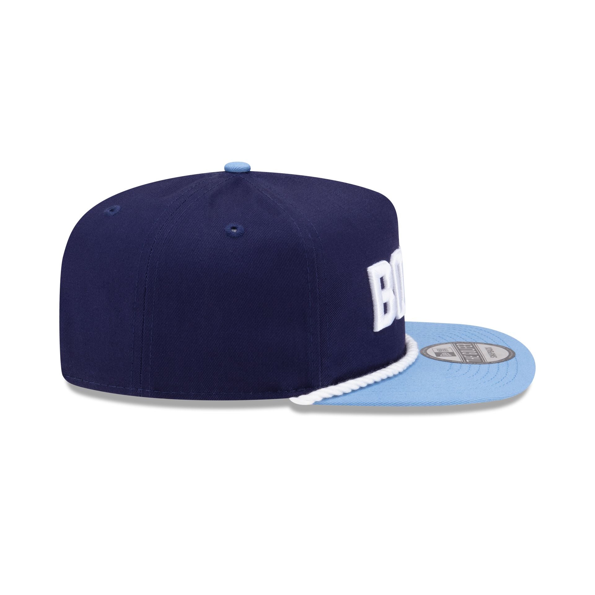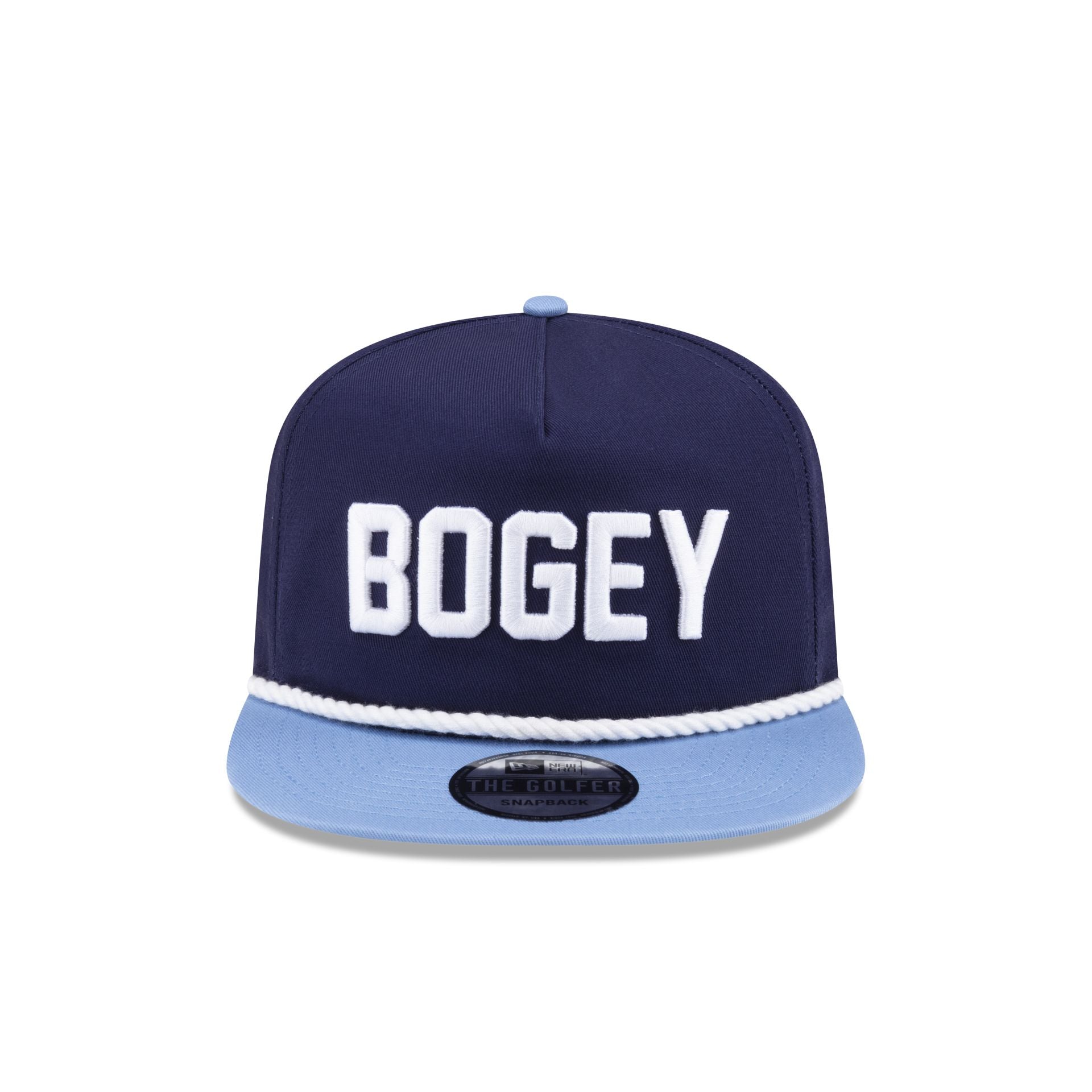 The New Era Golf Bogey Golfer features an embroidered Bogey wordmark at the front panels with a New Era Golf logo above a snapback closure at the rear and a blue undervisor.