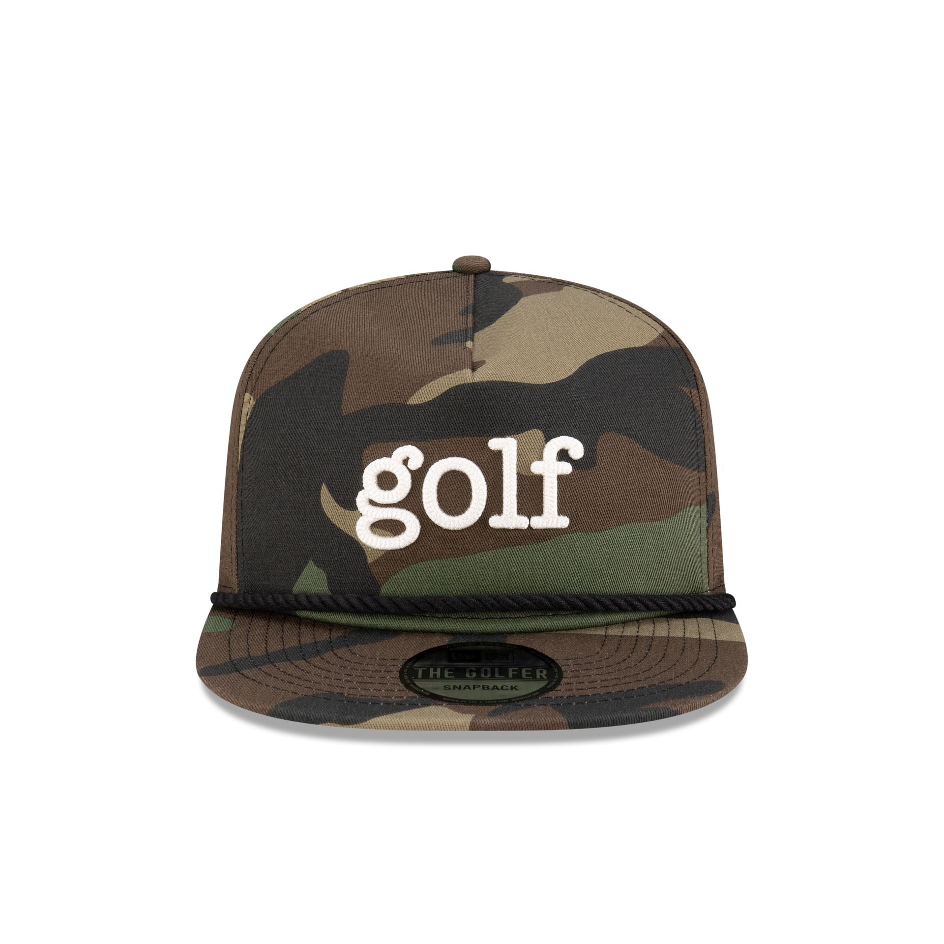 The New Era Golf Woodland Camo Golfer features an embroidered NEG golf wordmark at the front panels with and a NEG logo above a snapback closure at the rear.