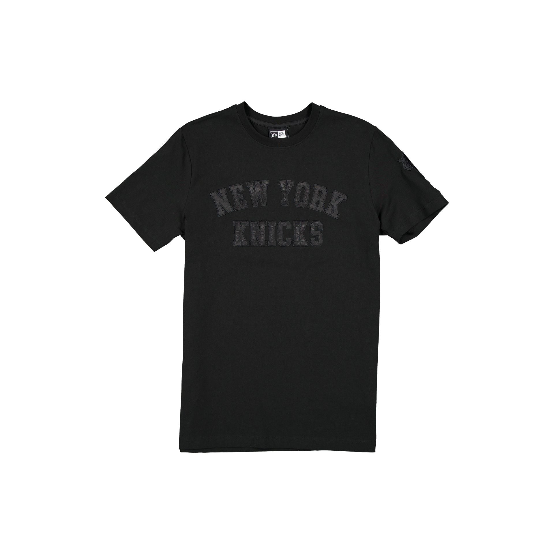 The New York Knicks Black on Black Logo Select T-Shirt features a satin applique with a tonal stitch Knicks wordmark at the chest and an embroidered team logo at the left-wear sleeve.
