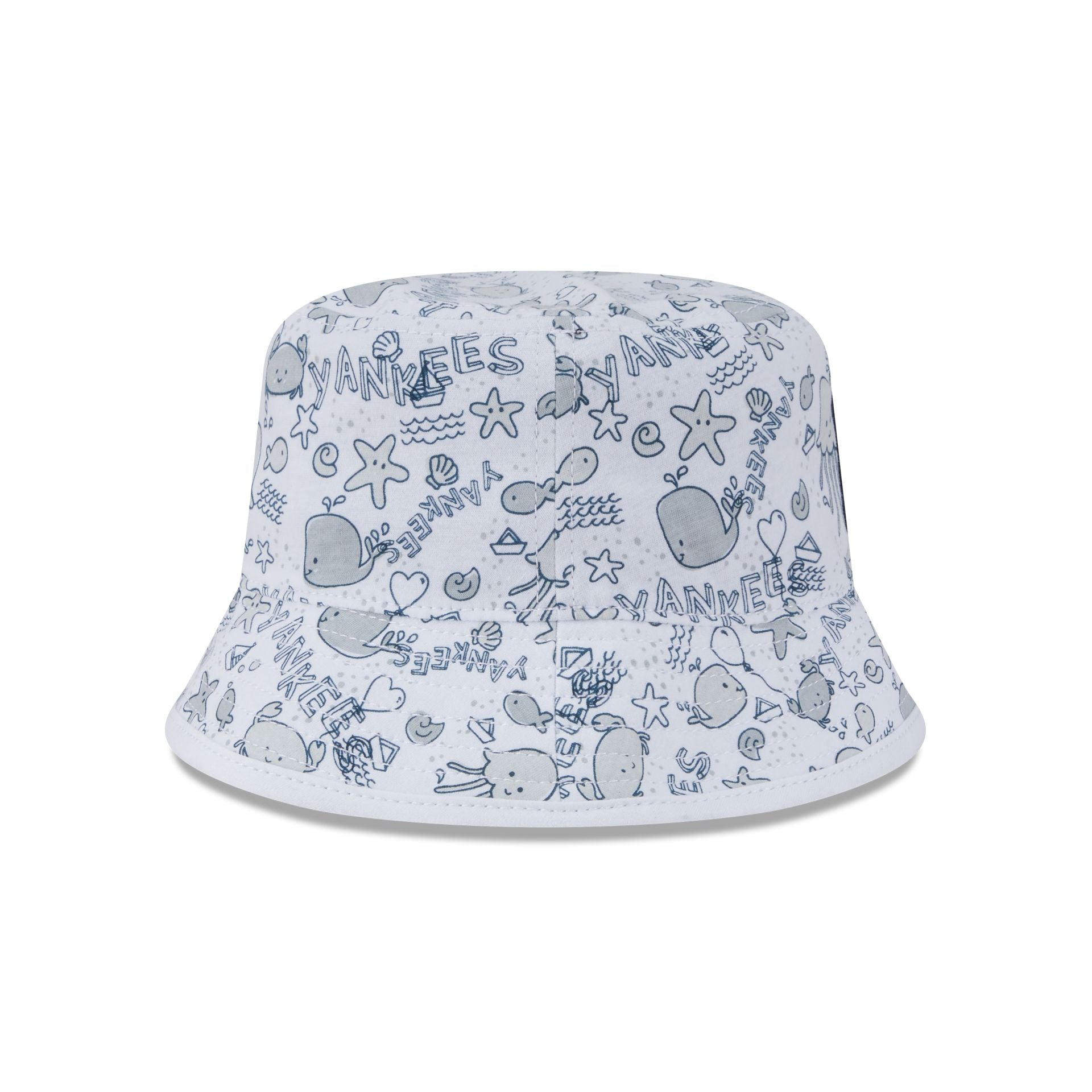 The New York Yankees Kids Ocean Bucket Hat features an embroidered Yankees logo at the front with a nautical design throughout the hat.