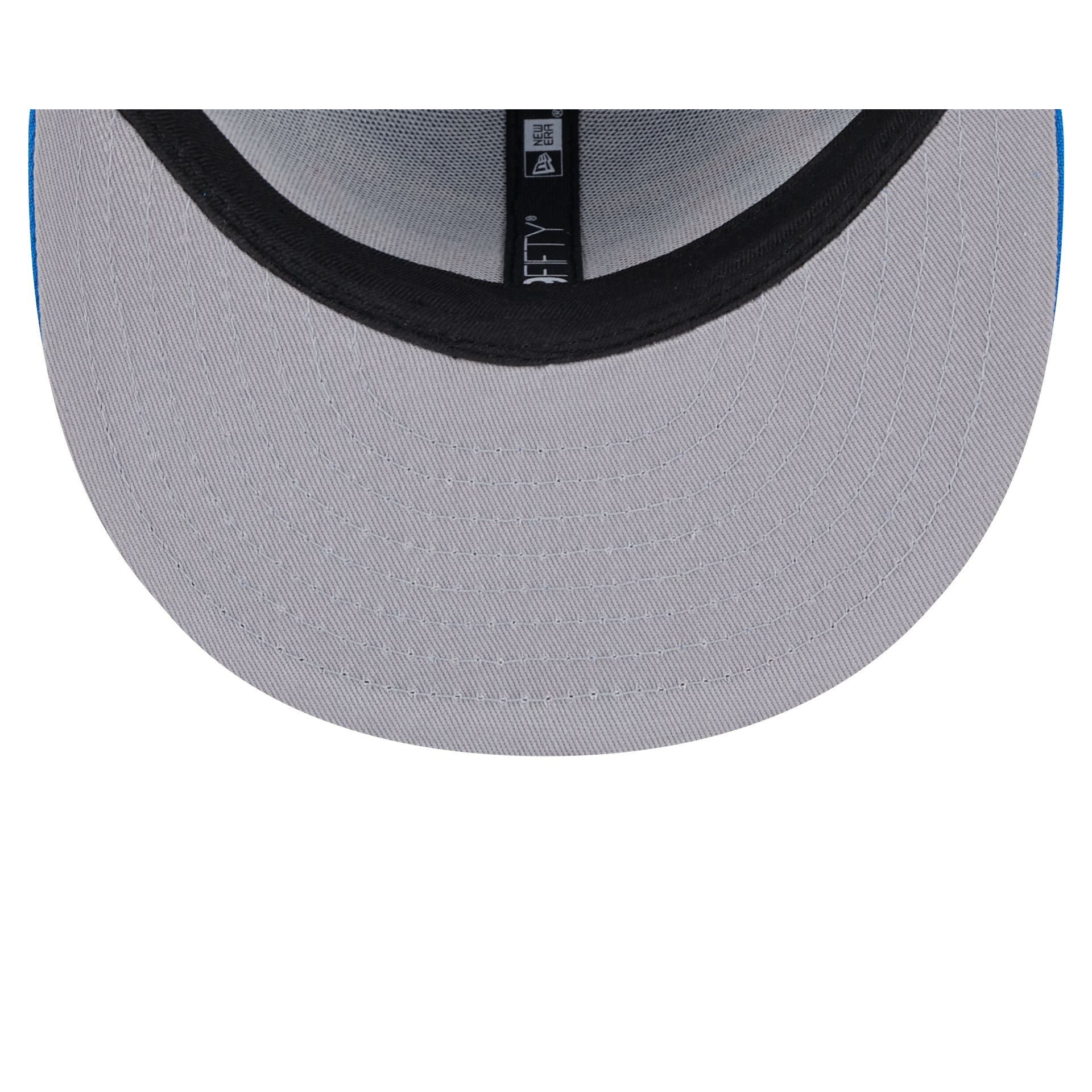 The Oklahoma City Thunder Kids 9FIFTY Snapback Hat features an embroidered Thunder wordmark at the front panels with a matching team logo at the right-wear side. Additional details include a gray undervisor and a snapback closure at the rear.