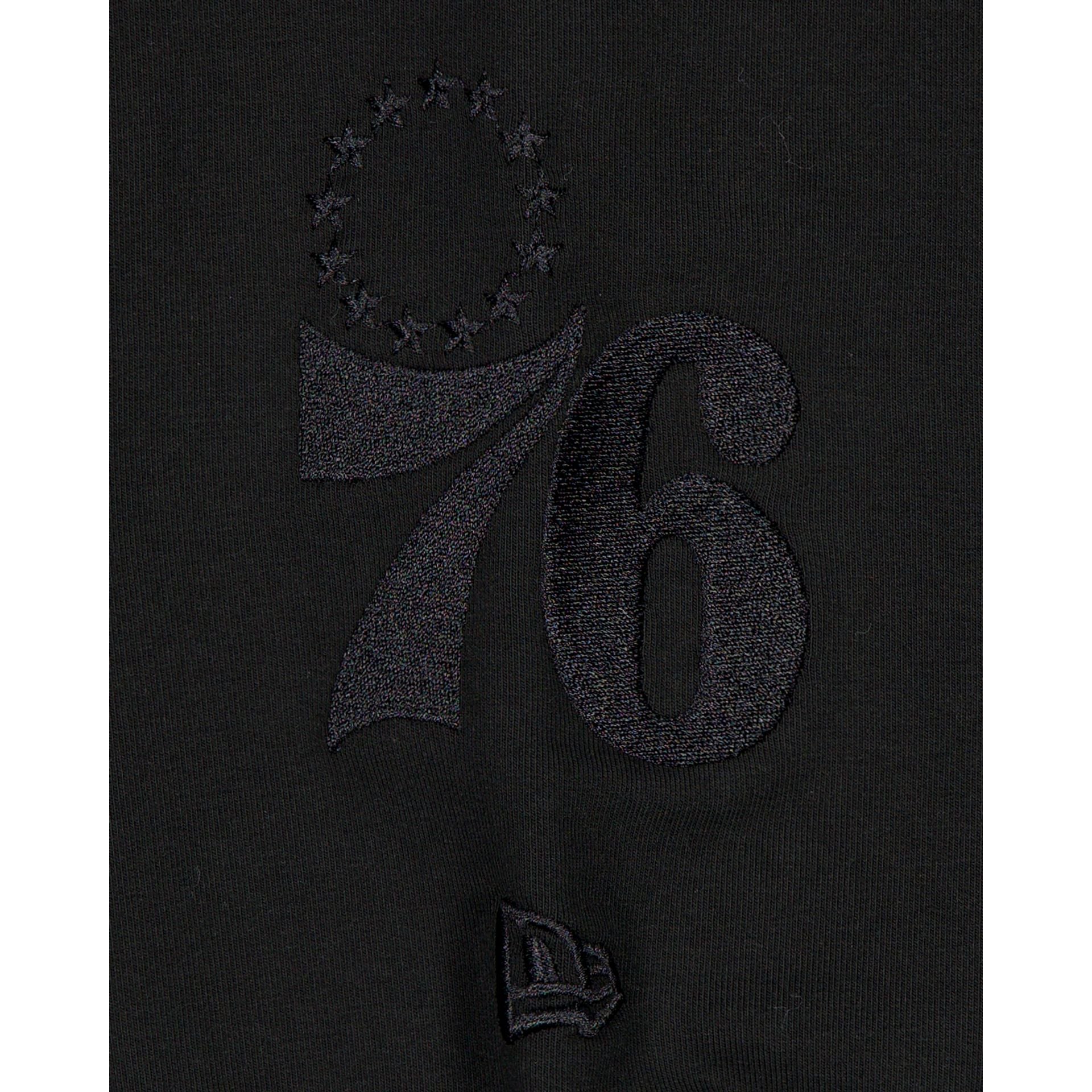 The Philadelphia 76ers Black on Black Logo Select Hoodie features a satin applique with a tonal stitch 76ers wordmark at the chest and an embroidered team logo at the left-wear sleeve.
