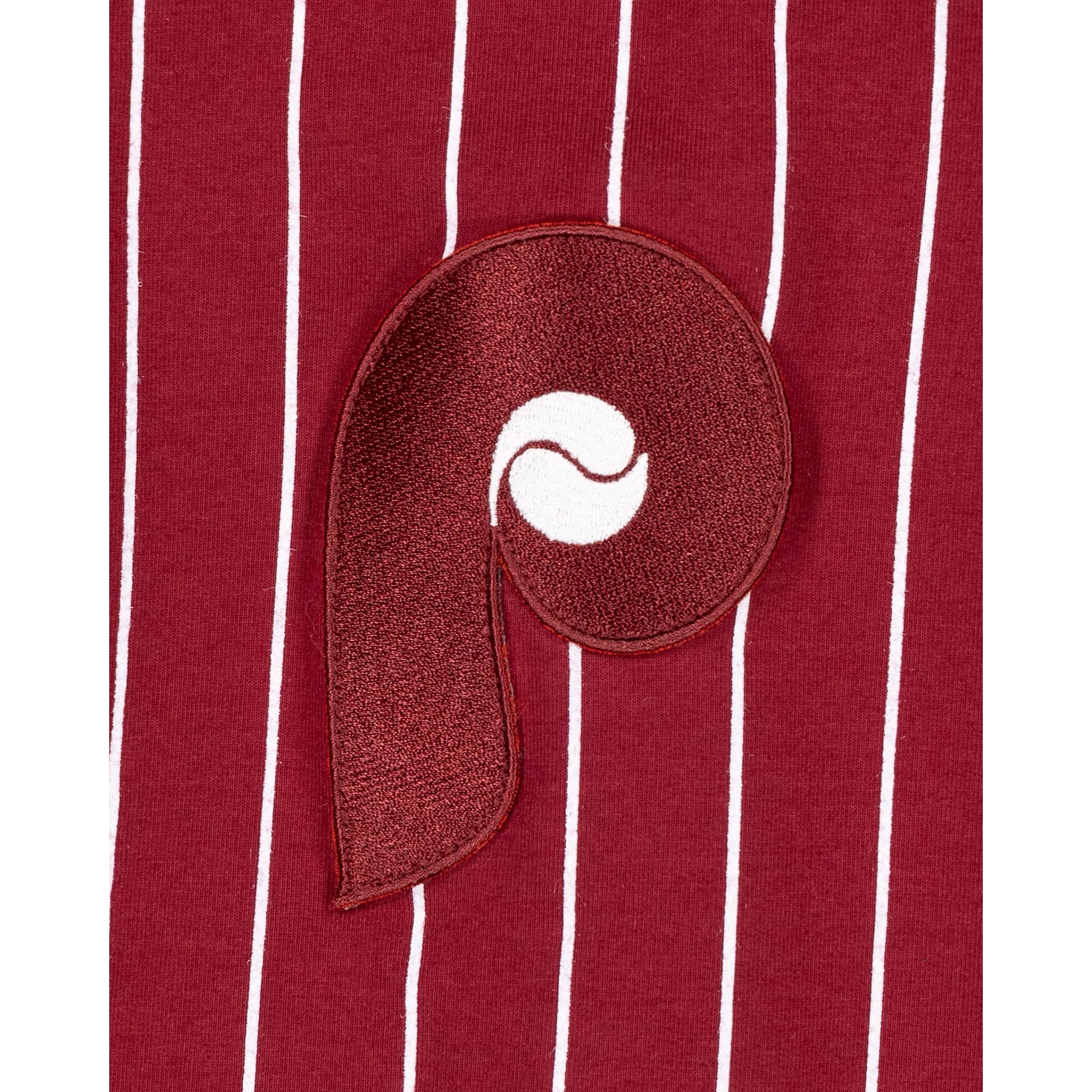 The Philadelphia Phillies Logo Select Pinstripe Hoodie features a chenille applique Phillies logo at the left chest with team patches at each sleeve and an embroidered team wordmark at the rear.