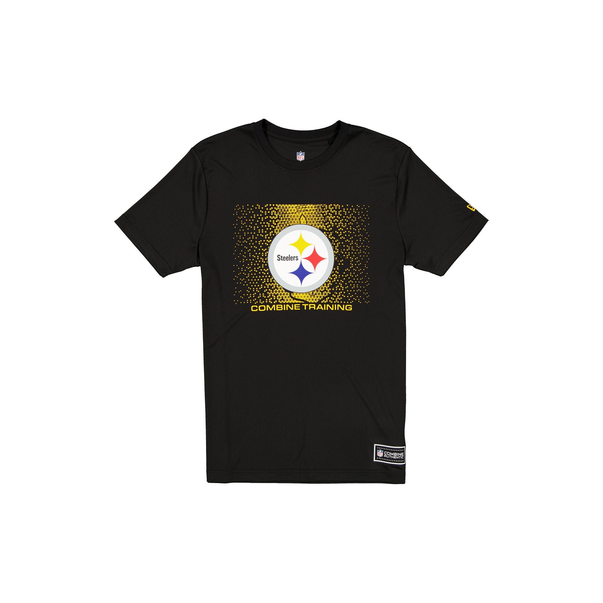 The Pittsburgh Steelers 2025 Training Digi Shadow T-Shirt features a screen-printed Steelers logo and digi graphic at the chest with a heat sealed NFL Combine Authentic jock tag at the hem.