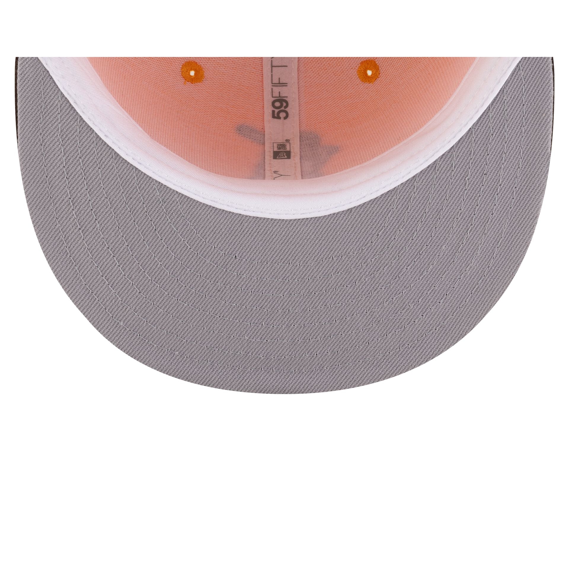 The San Diego Padres Mascot Yellow 59FIFTY Fitted Cap features an embroidered Padres mascot at the front panels with a matching MLB Batterman logo at the rear. Additional details include a farewell patch at the right-wear side and a gray undervisor.