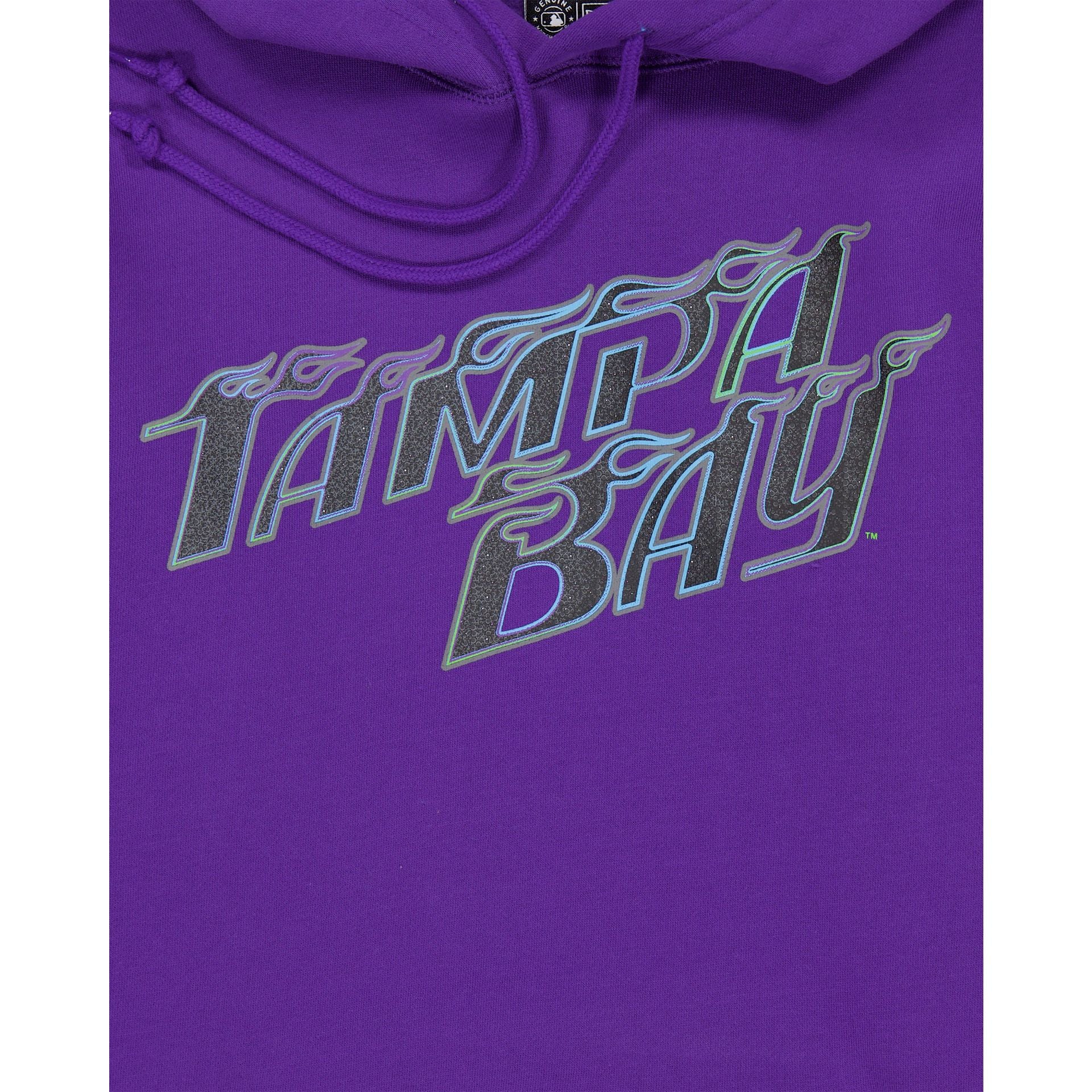 The Tampa Bay Rays City Connect Purple Hoodie features a screen-printed Rays wordmark at the front with alternate team logos at the left sleeve.