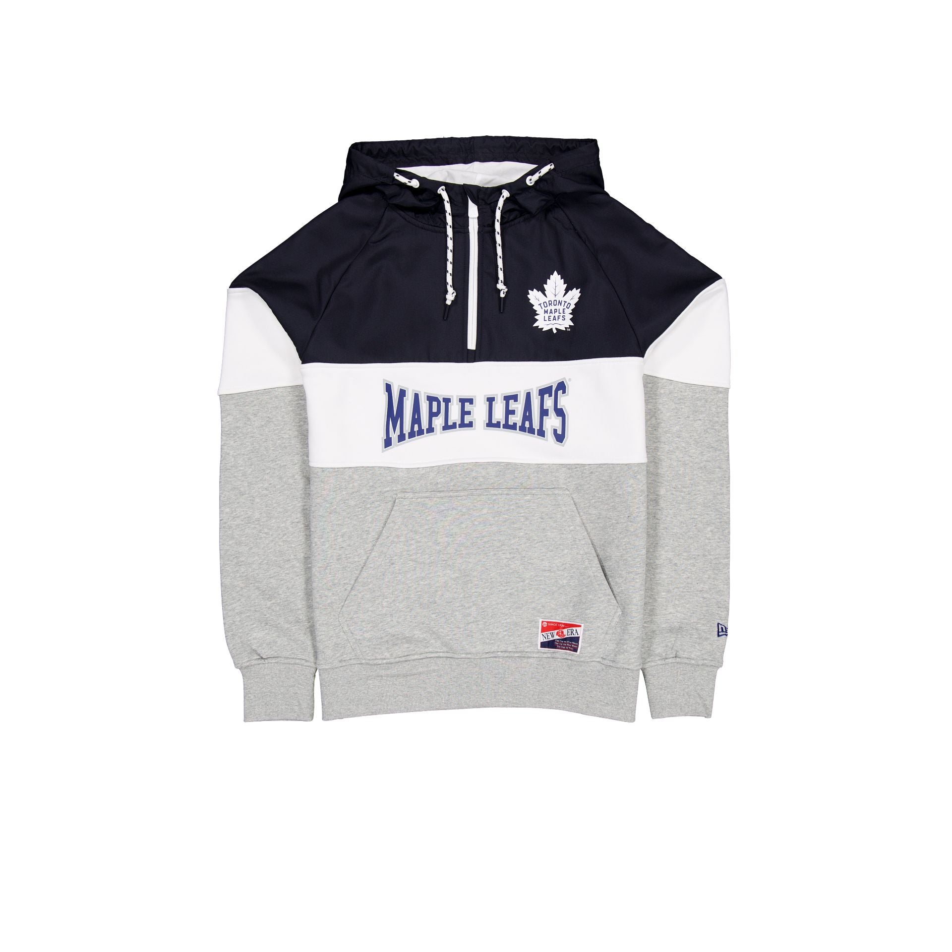 The Toronto Maple Leafs Throwback Color Block Hoodie features a screen-printed Maple Leafs logo and team wordmark at the front with a quarter zip closure at the collar.
